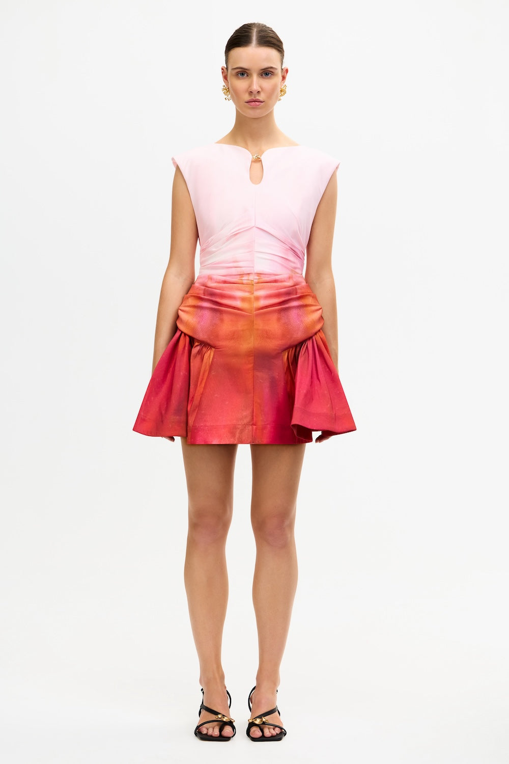 Embodying architectural artistry, the Bromton Mini Dress in Mimosa Sunrise commands attention with its sculpted silhouette and vivid placement print. Crafted from woven stretch dupion and fully lined for structure and comfort, this defined mini is accented by striking gold hardware at the centre front. Ideal for event dressing, it offers a refined balance of boldness and polish.