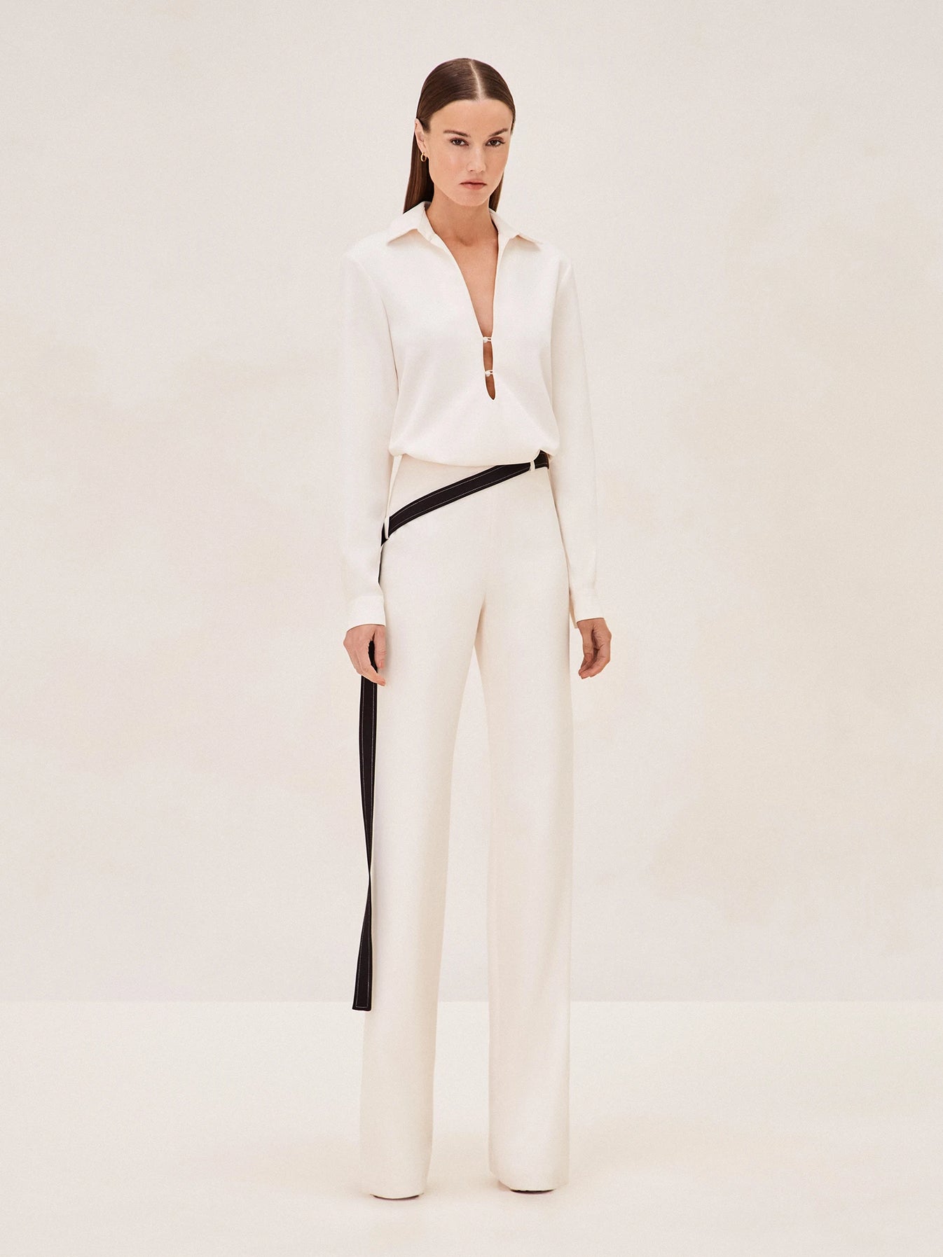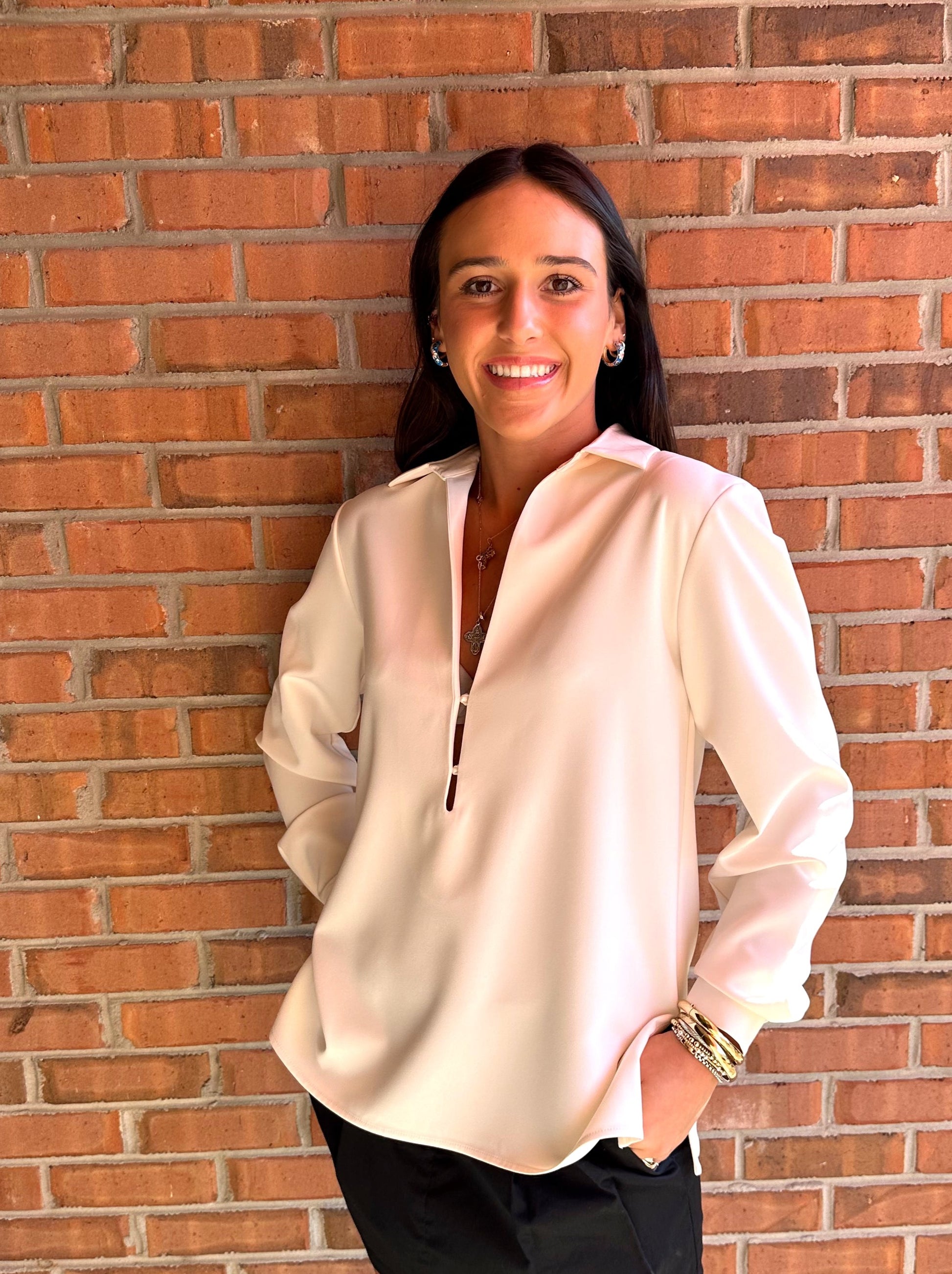 Embody effortless sophistication with the Morrison Top, a masterclass in minimalist luxury. Crafted from sumptuous fabric, this blouse captivates with its subtle sheen and fluid drape. Its understated elegance is punctuated by a tasteful V-neck, adorned with a singular hardware detail that adds a touch of modernity. The relaxed silhouette is tailored with precision, offering both comfort and a flattering fit.