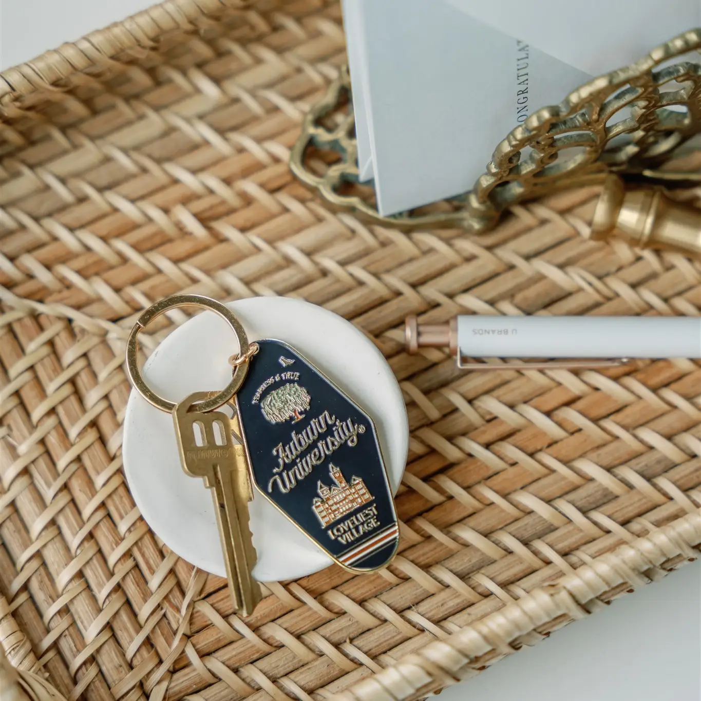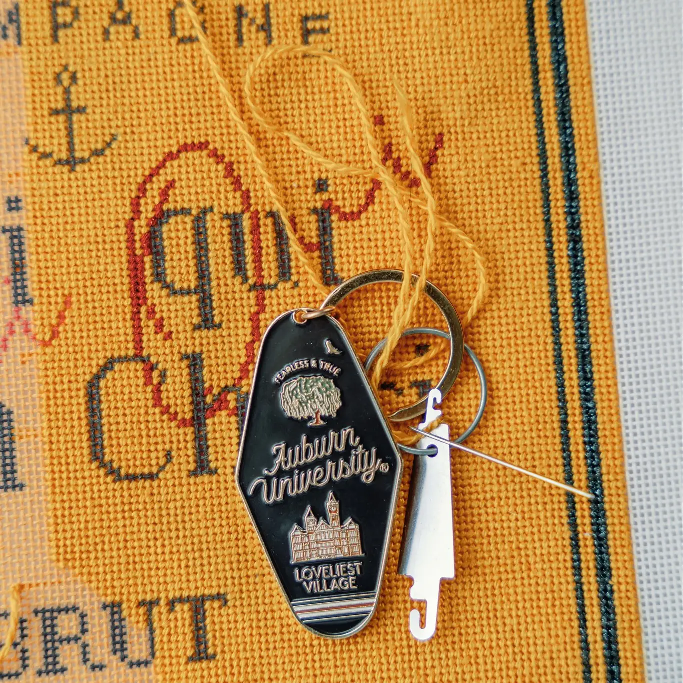 OFFICIALLY LICENSED BY AUBURN UNIVERSITY Enamel keychain featuring Auburn University's Samford Hall and Toomer's oak trees in a motel keychain shape! * 2.5" enamel keychain with gold loop * Packaged in cello sleeve with backer board