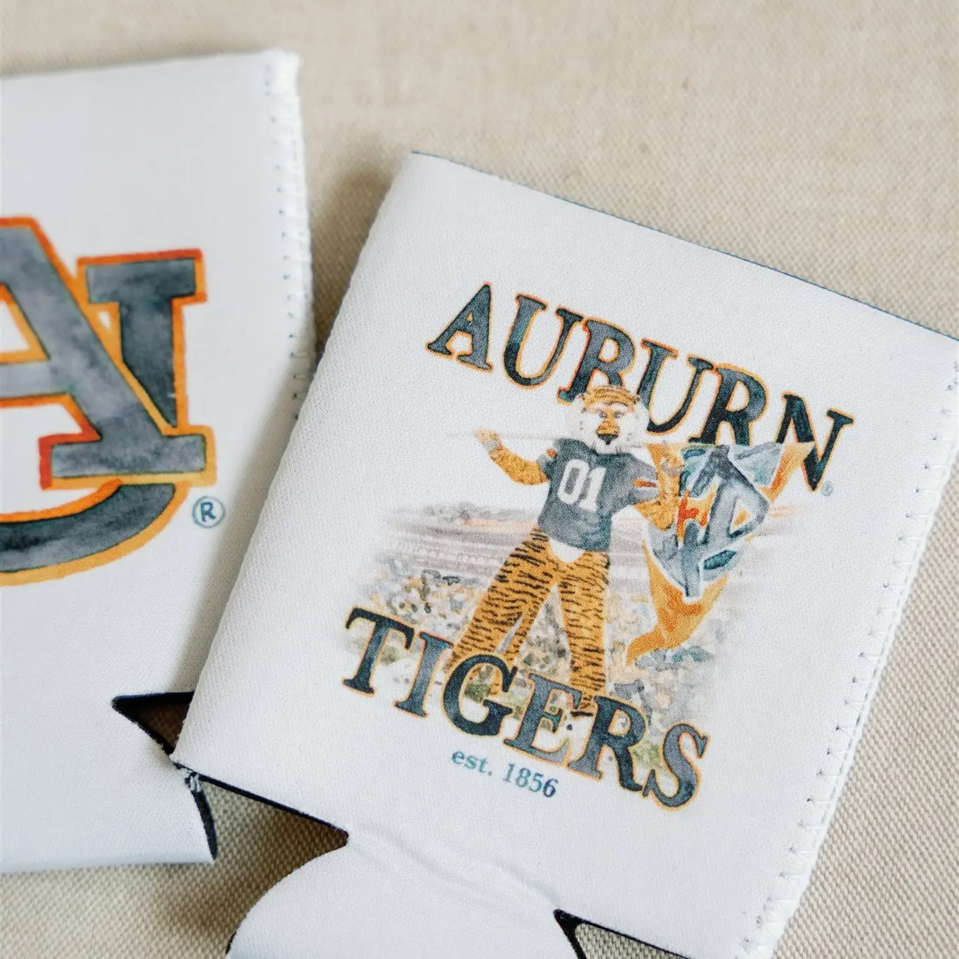 This 12 oz white double sided can cooler features Auburn's AU logo and Aubie the Tiger. It is made of high quality neoprene material. Auburn, collegiate, tailgate, fall, football, beer, soda, college, coozie, koozie, war eagle