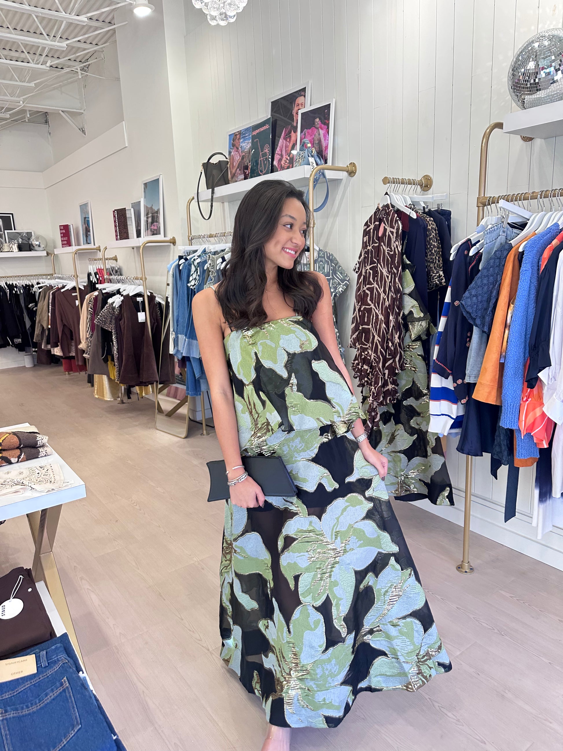 Effortlessly romantic, the Elysia Tiered Gown in Black & Green Floral is designed for special occasions that call for statement elegance. Cut from a floral jacquard fabrication, this gown showcases a rich woven texture and delicate floral motif that catches the light with every movement.