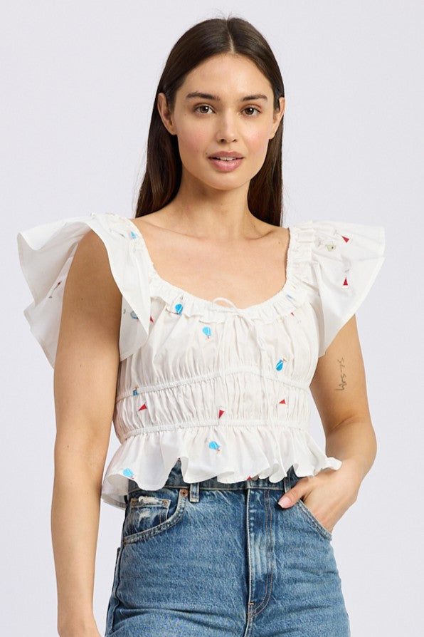 - Novelty Icon Embroidered Elastic Waist Detail Top With Flutter Sleeves