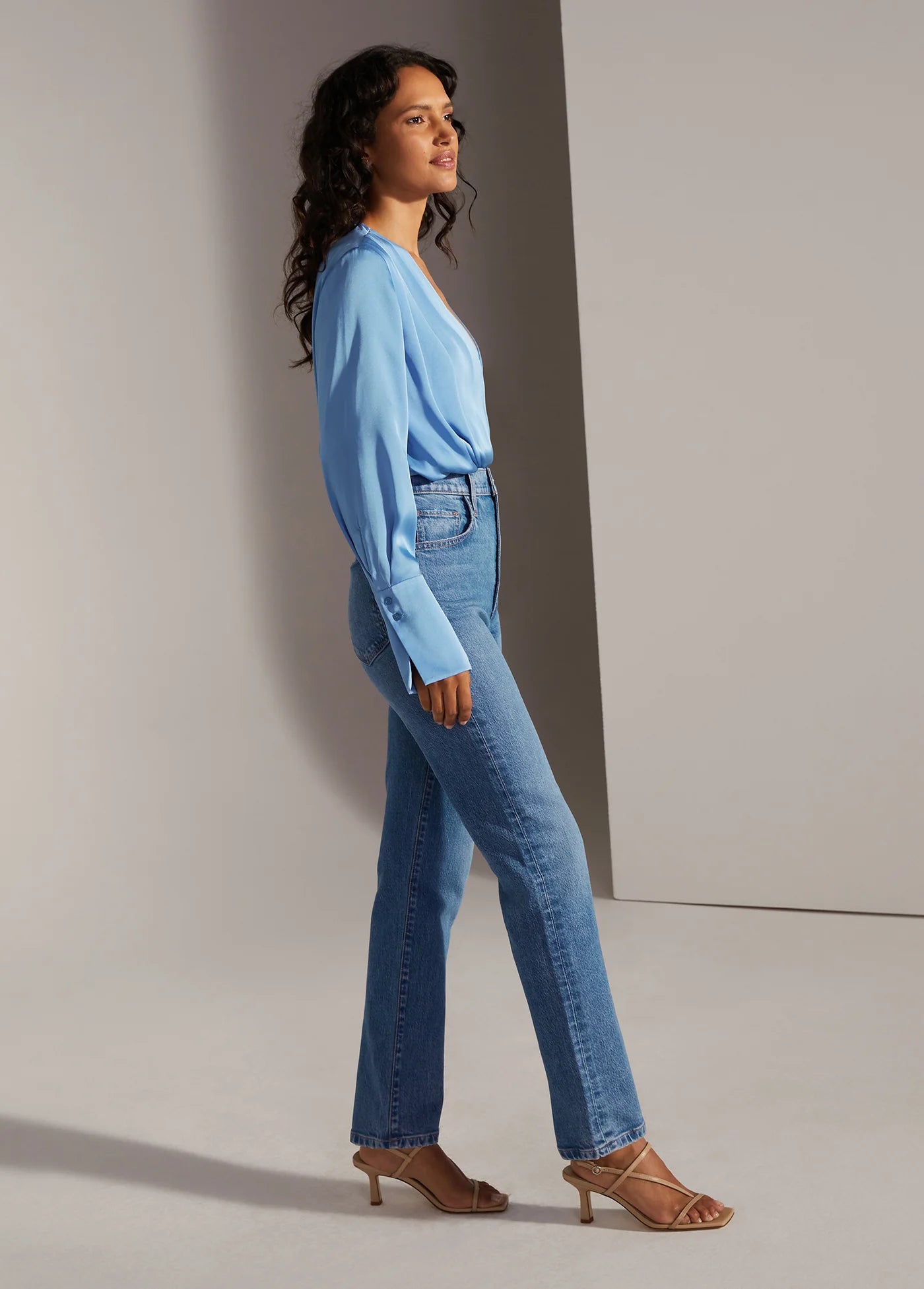 Our new Valentina silhouette in Crosby is a true straight leg ankle. Made from a crystal, light-blue indigo wash. Meant for everyday wear, this style is fitted at the hips and straight down from thigh to opening. (Favorite Daughter embroidery on the back waistband, of course.)