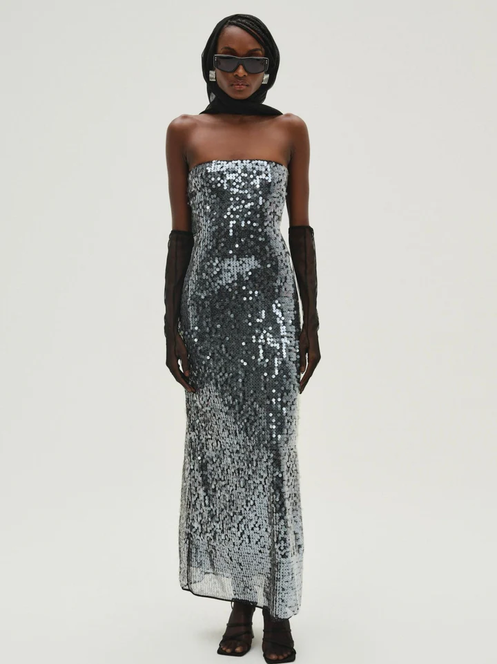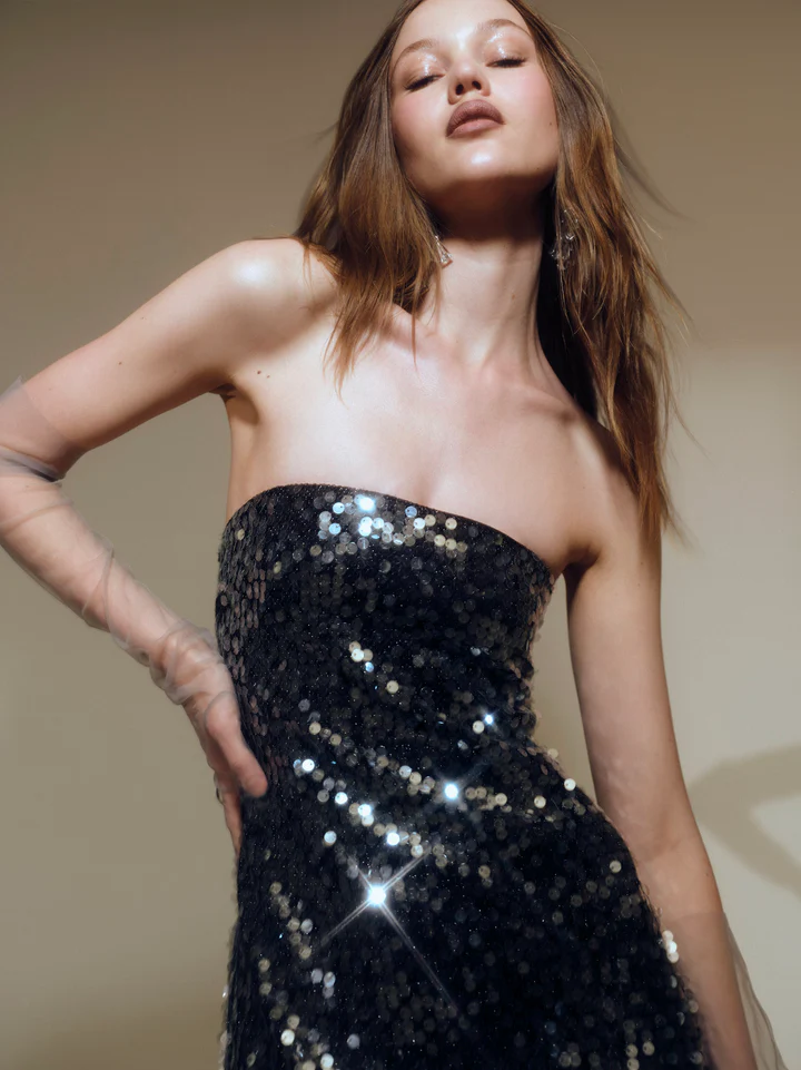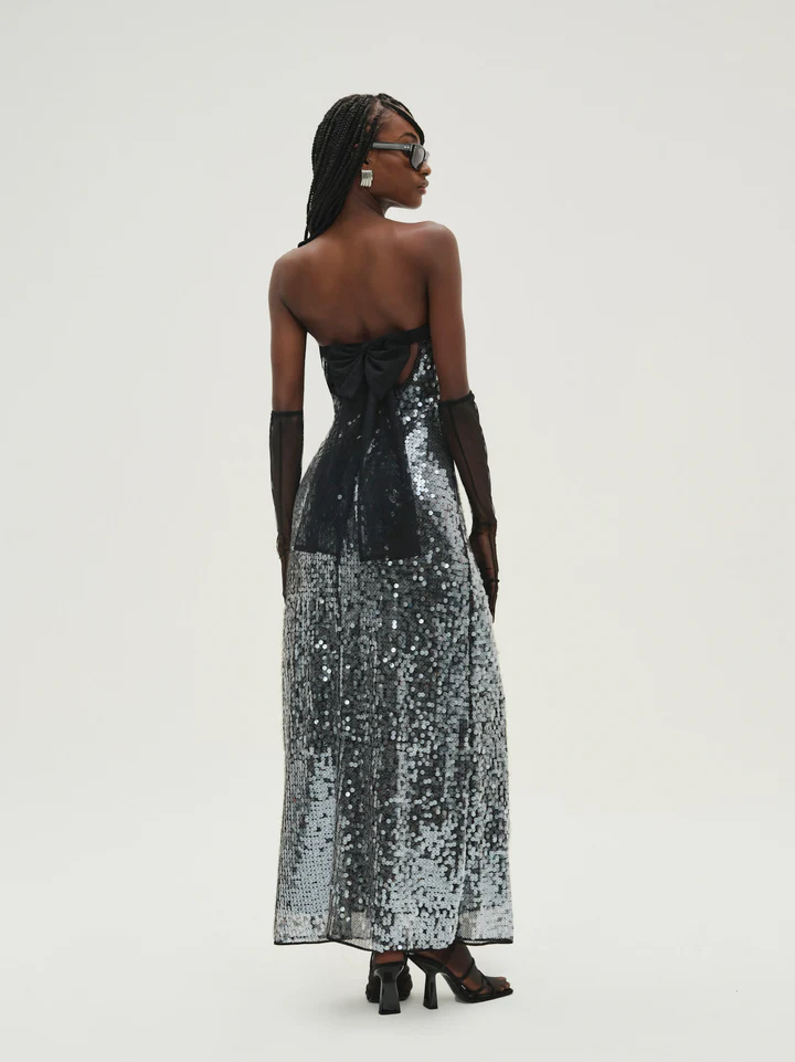You’re invited to the greatest party of all time with the Christelle black maxi dress—a strapless sequin gown that twinkles under the spotlight. Cut to a body-skimming, column silhouette, this chic style spotlights a low-cut back, adorned with a functional tulle bow. It's the perfect holiday party or New Year's Eve dress.