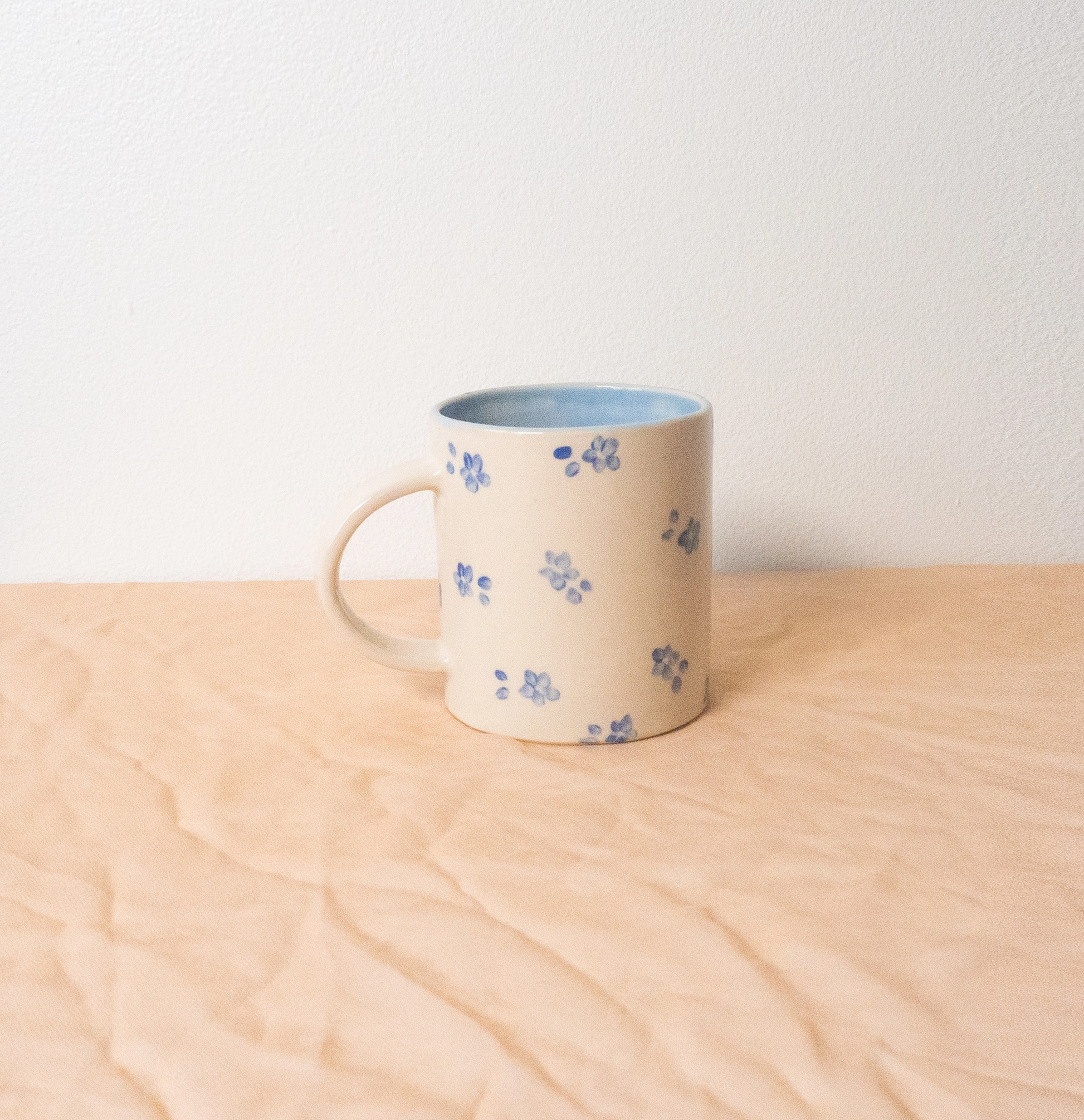 Handmade ceramic mug made with a creamy white stoneware clay, thoughtfully hand painted and glazed with food safe ceramic materials The perfect mug to elevate your morning ritual. Hand painted forget-me-not inspired flowers and a matching glazed interior