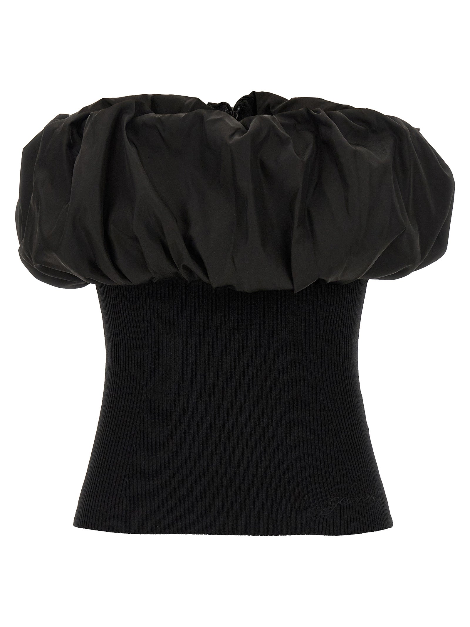 'Melange Knit' top consisting of sleeveless off-the-shoulder top in curled technical fabric, back zip closure and lower part in ribbed stretch viscose, tone-on-tone logo embroidery on the front, and garment with raw cut hem.