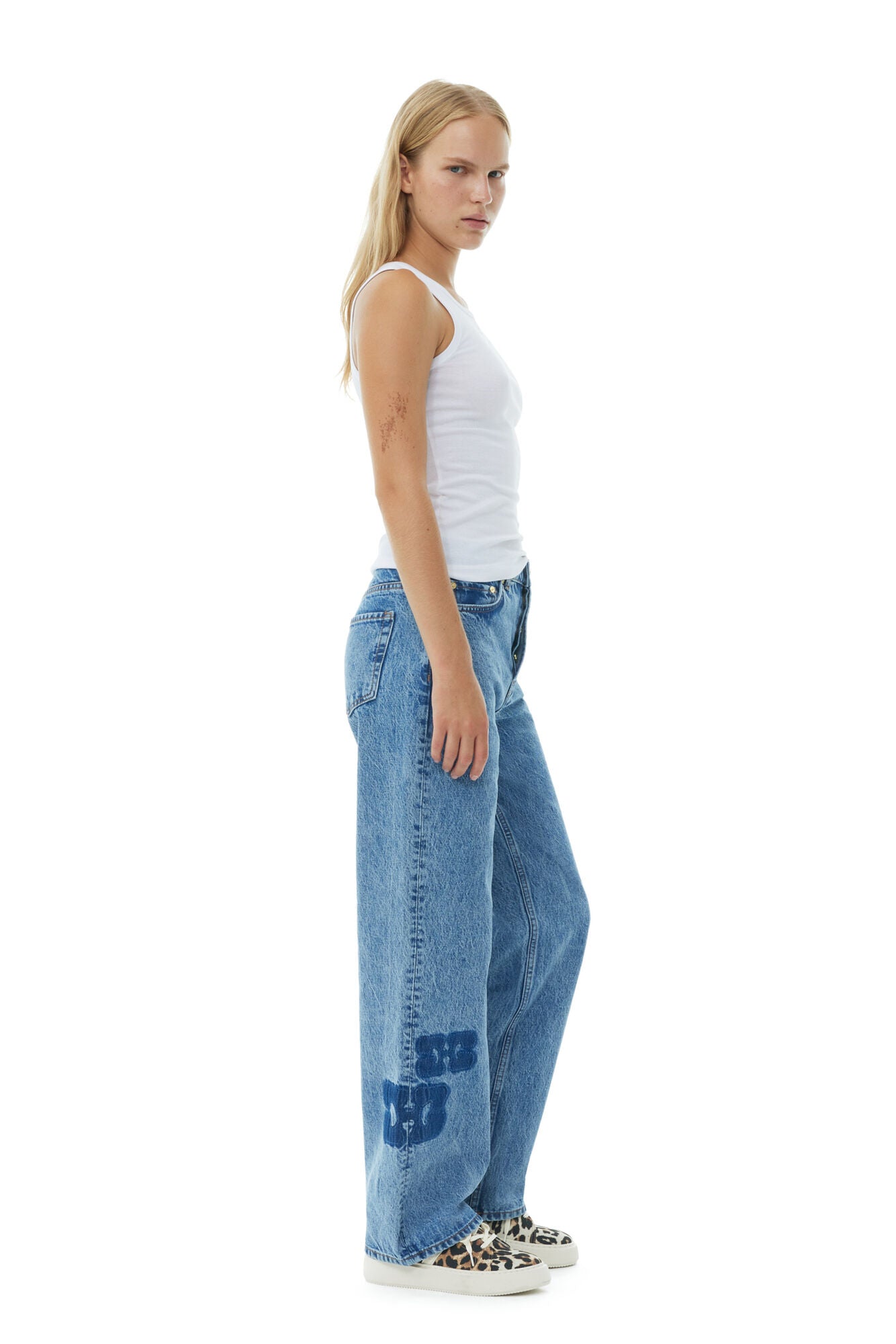 These Mid Blue Stone Patch Izey Jeans are designed for a relaxed fit with straight, loose legs, a mid-to-low waist with a dropped crotch and GANNI logo patches.