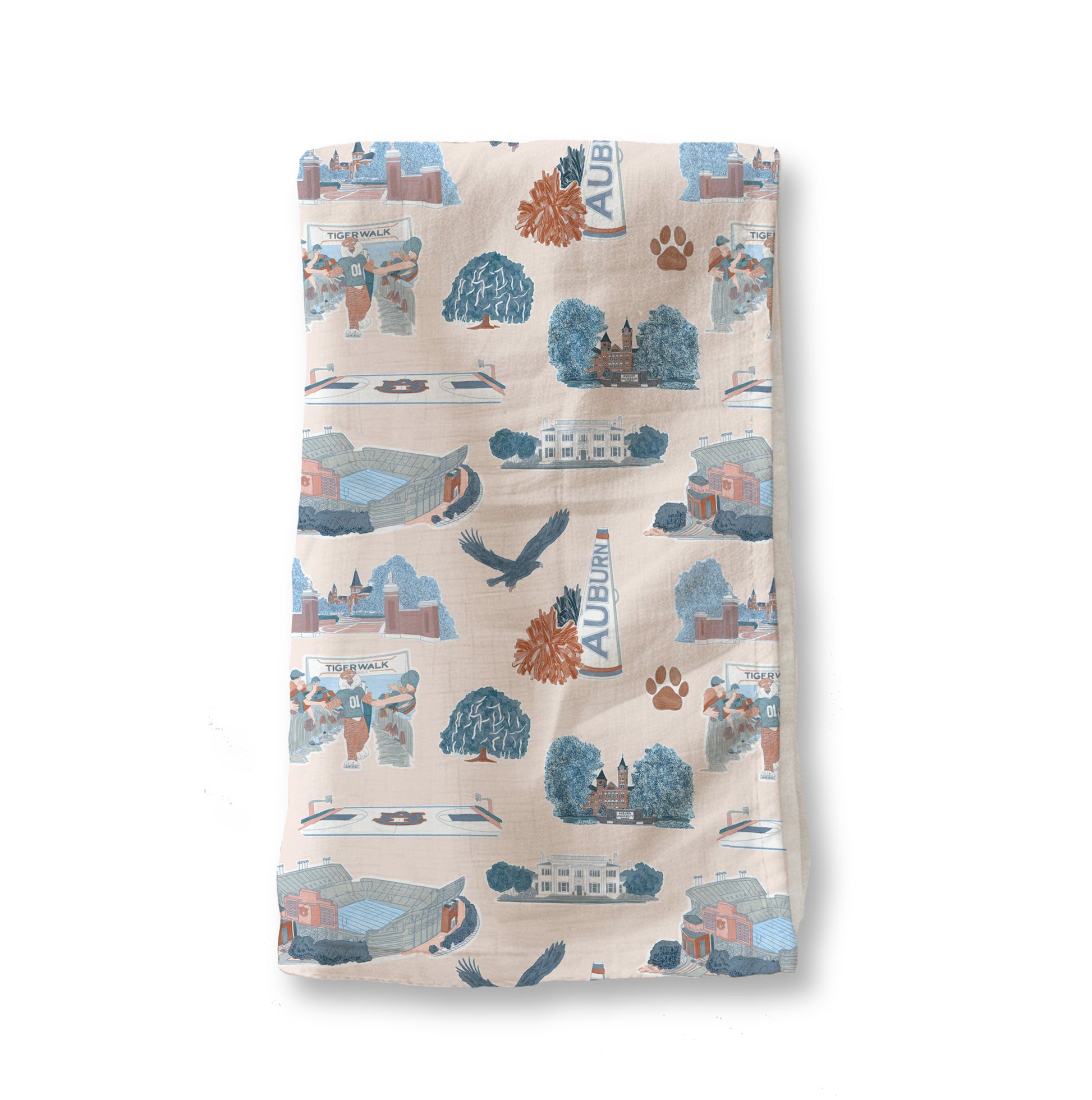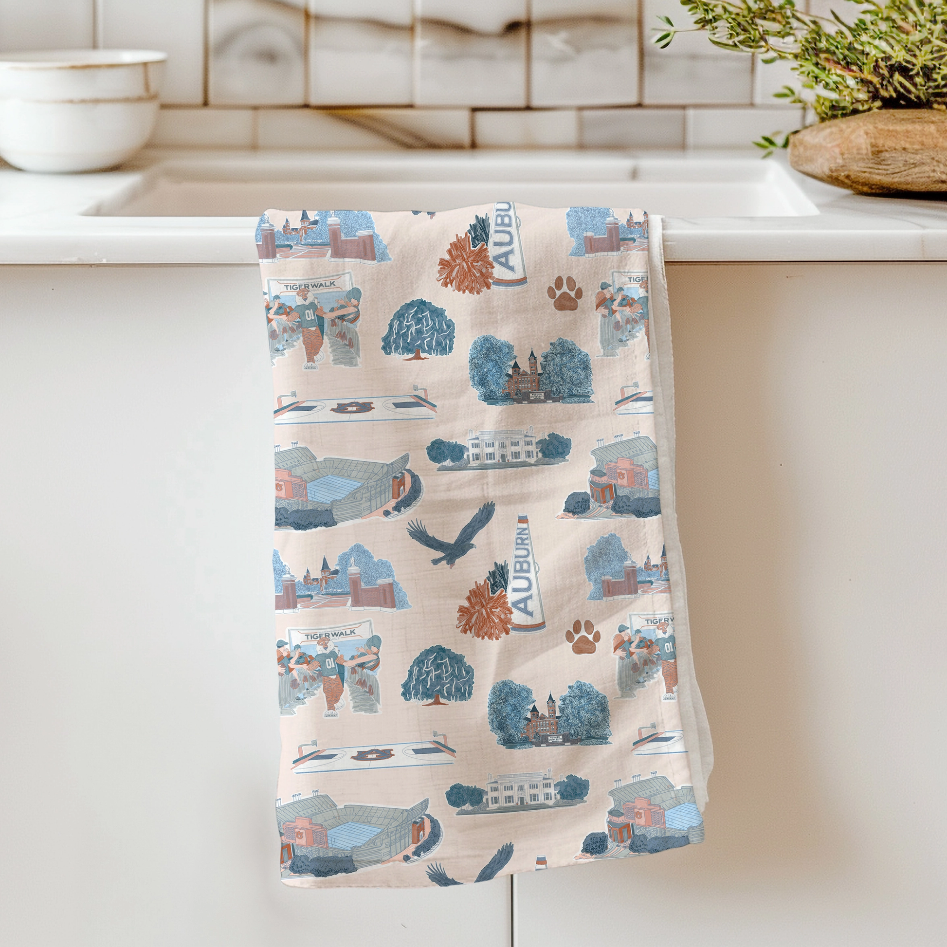 19x29 inch 100% cotton flour sack tea towel featuring an Auburn University pattern.