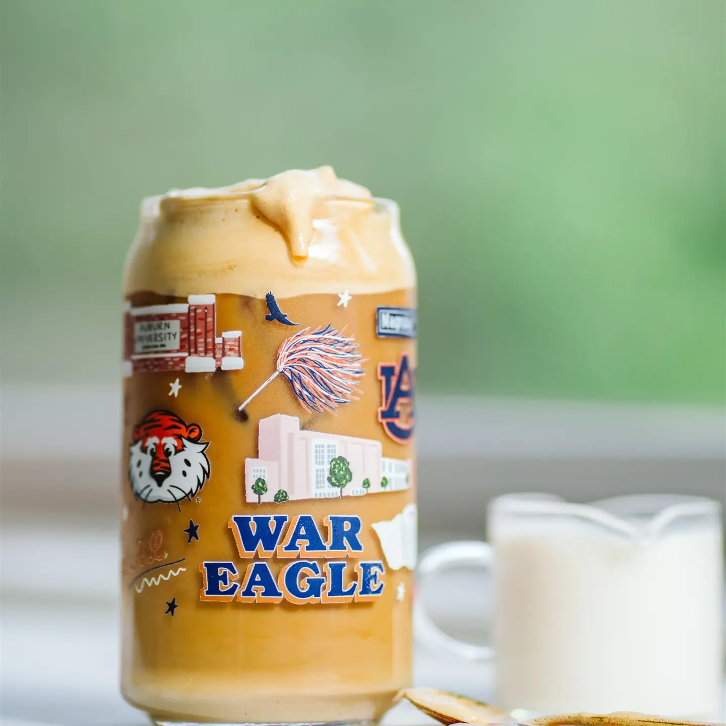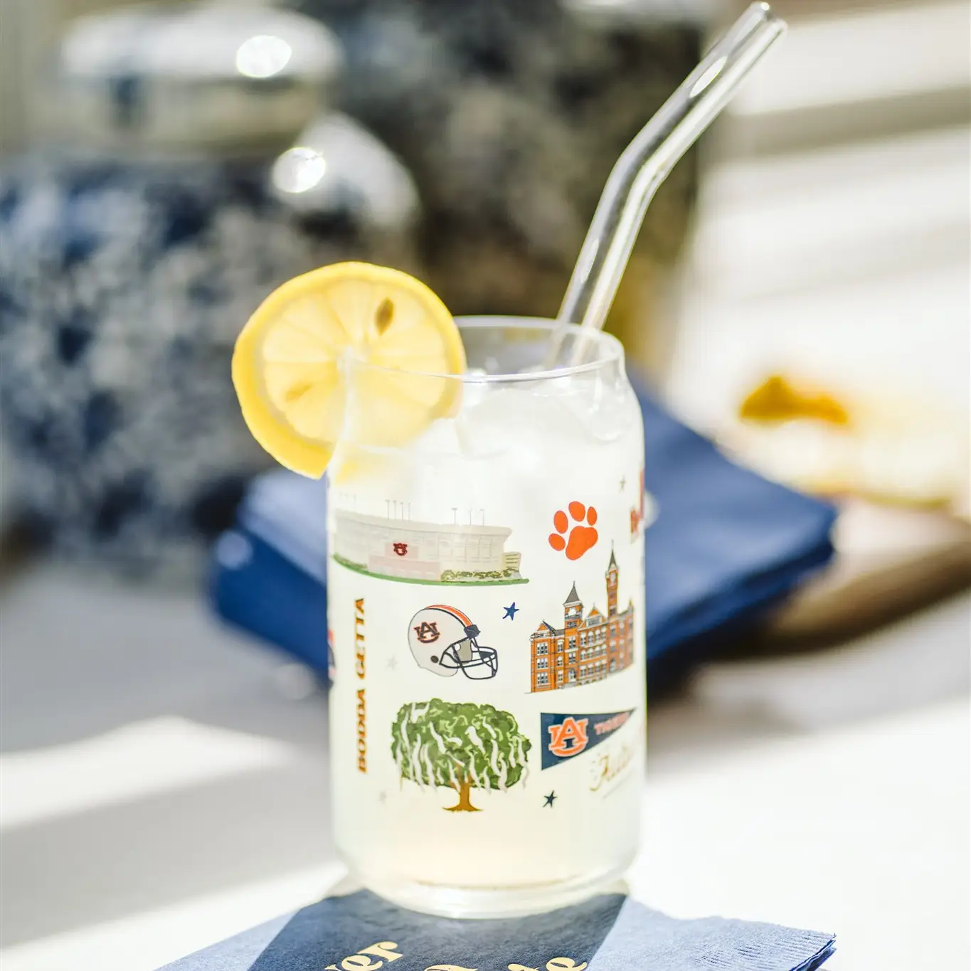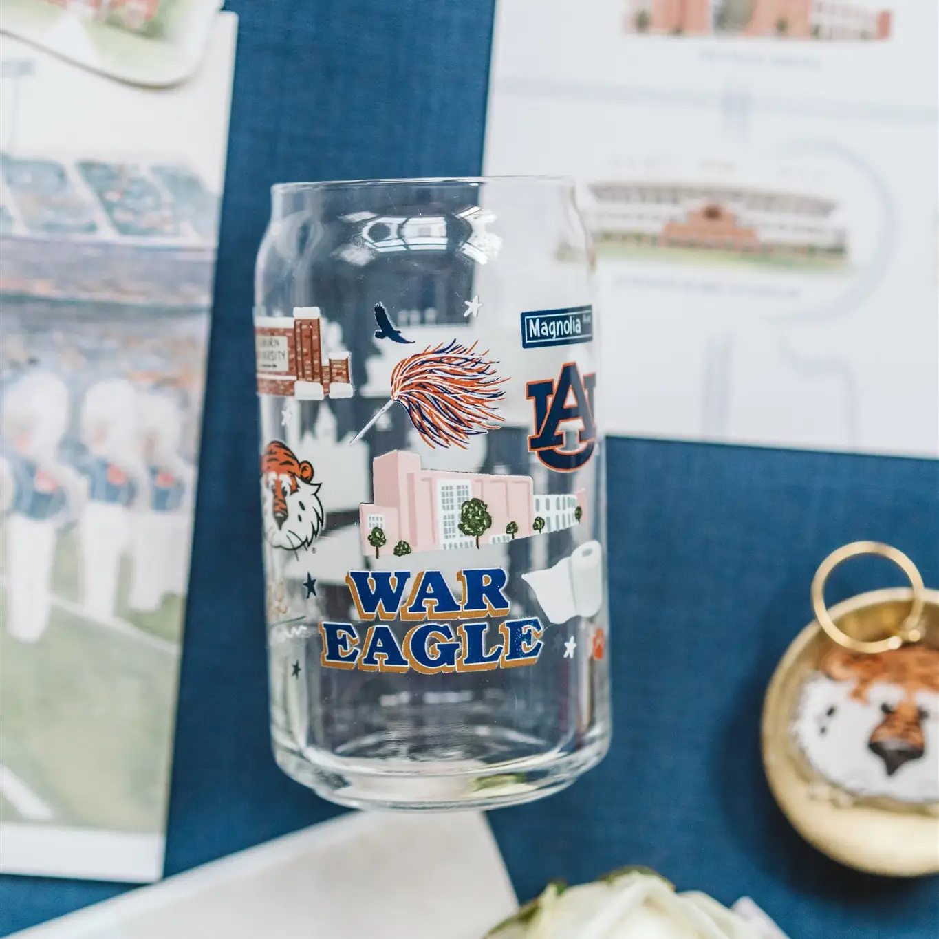 16 oz full color glass cup featuring important Auburn icons, such as Aubie, Samford Hall, Jordan-Hare Stadium, Neville arena, and more!