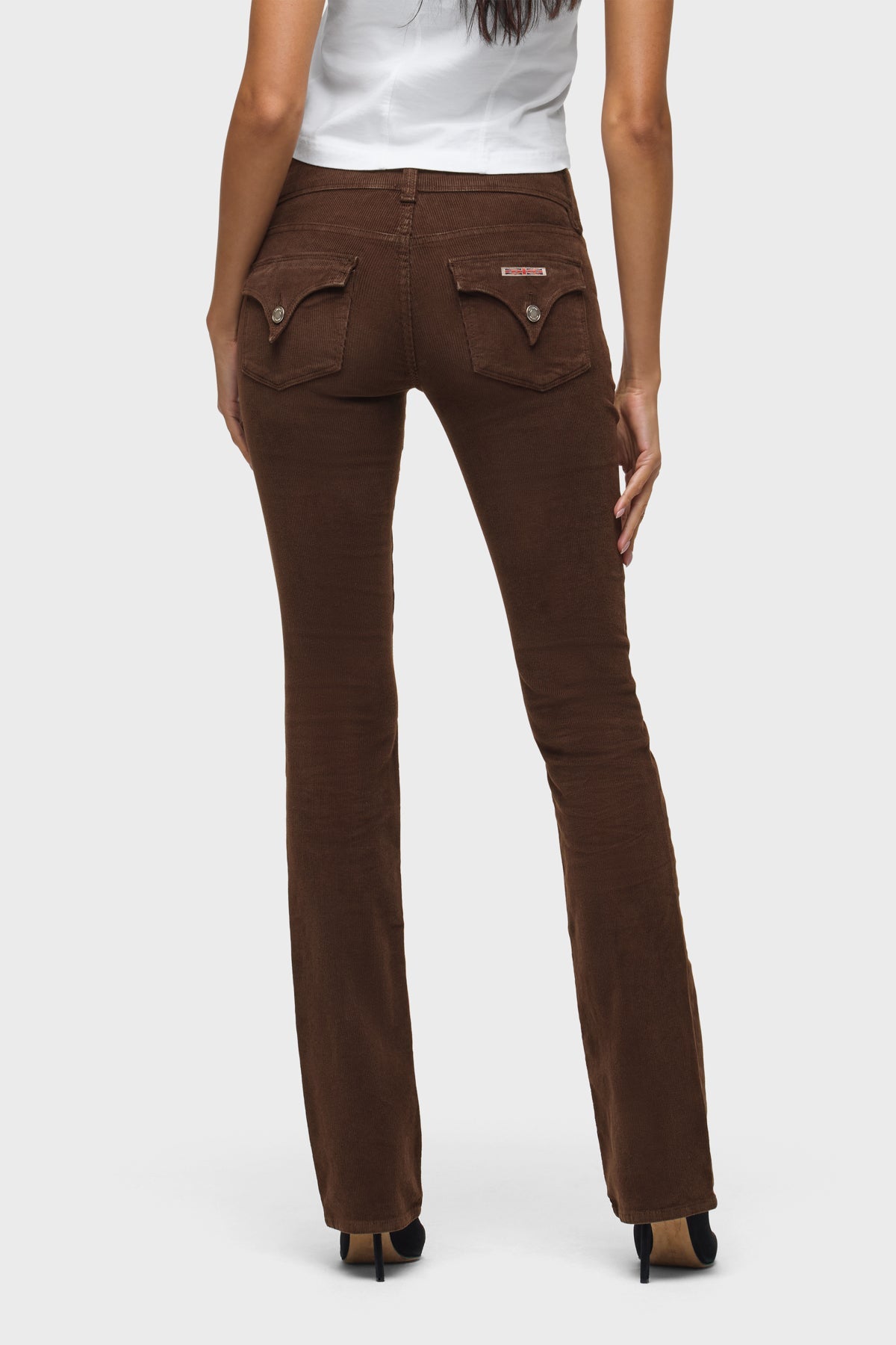 The Beth Mid-Rise Baby Bootcut Pant with Flap in Black Coffee Cord features a subtly flared silhouette and our signature button-flap back pockets. This pair is cut from stretch corduroy in a chocolate brown color. A 34.5" inseam and clean finished hem complete the look.