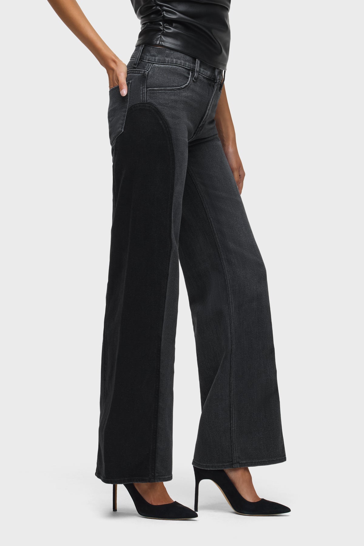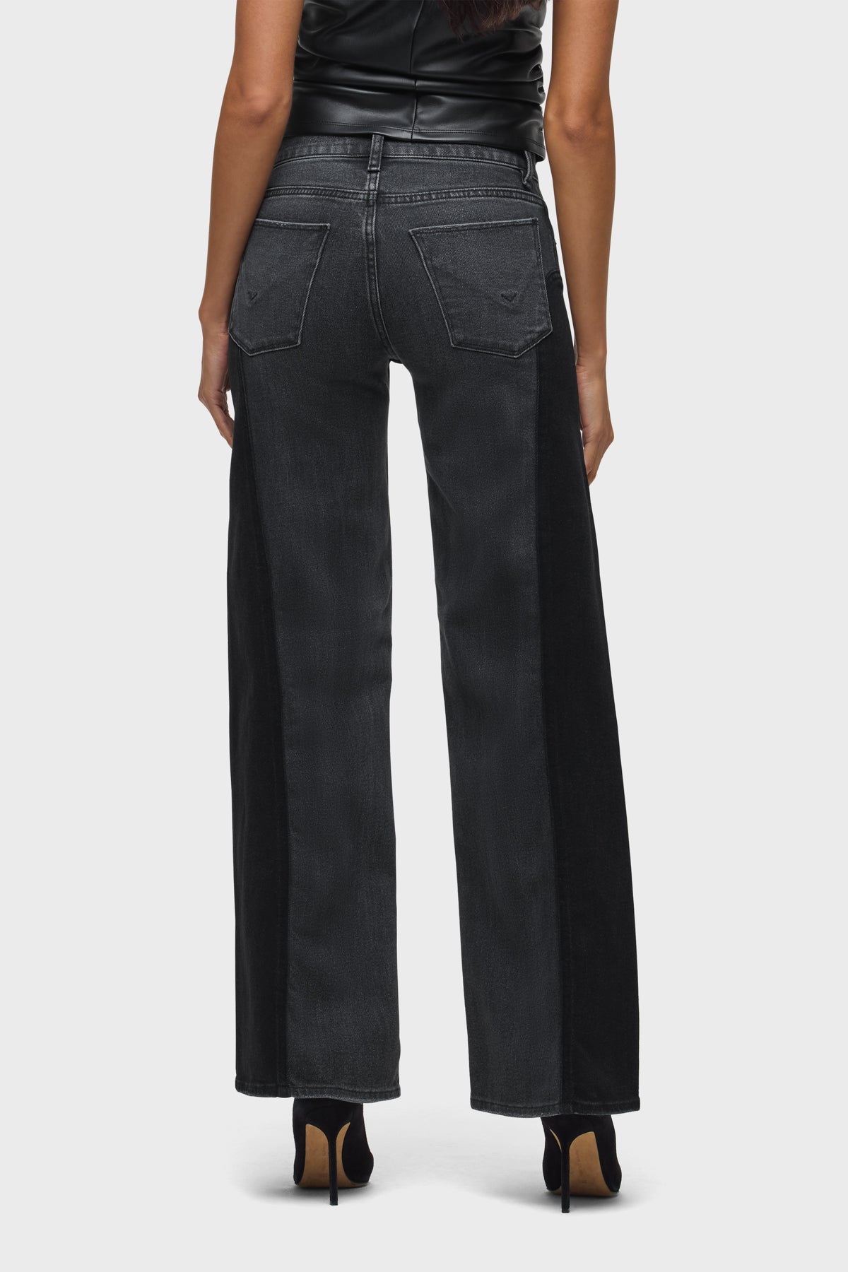 The Lexi Seamed Wide Leg Jean in Double Side features a washed black body with a contrasting clean black side inset. These jeans are made of comfort stretch black denim with a clean finished hem.