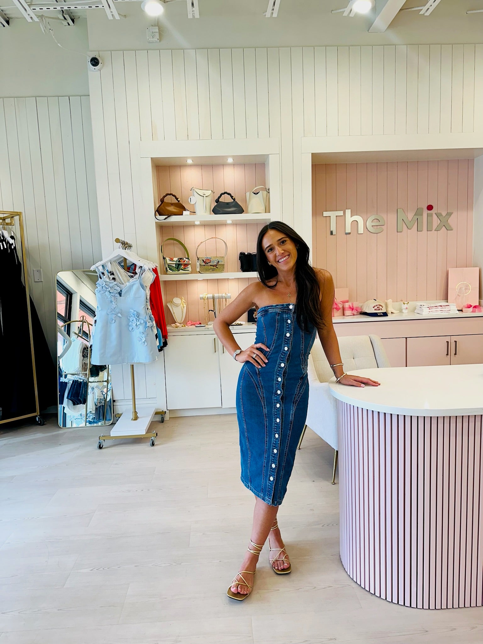 Our Strapless Seamed Midi Dress in Cupcake features flattering curved seam lines and an exposed button placket down the front. This strapless dress is made of stretch denim designed to hug every curve in a medium dark indigo wash with heavy stone washing.