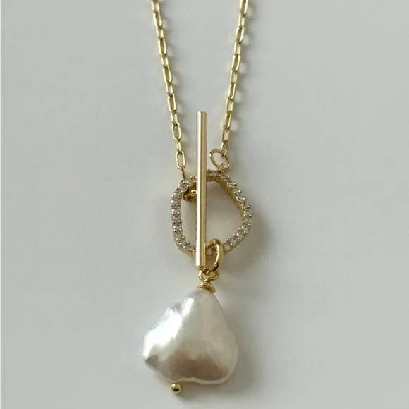 Gold plated dainty chain necklace featuring clear Cz embedded toggle clasp with natural baroque pearl pendant