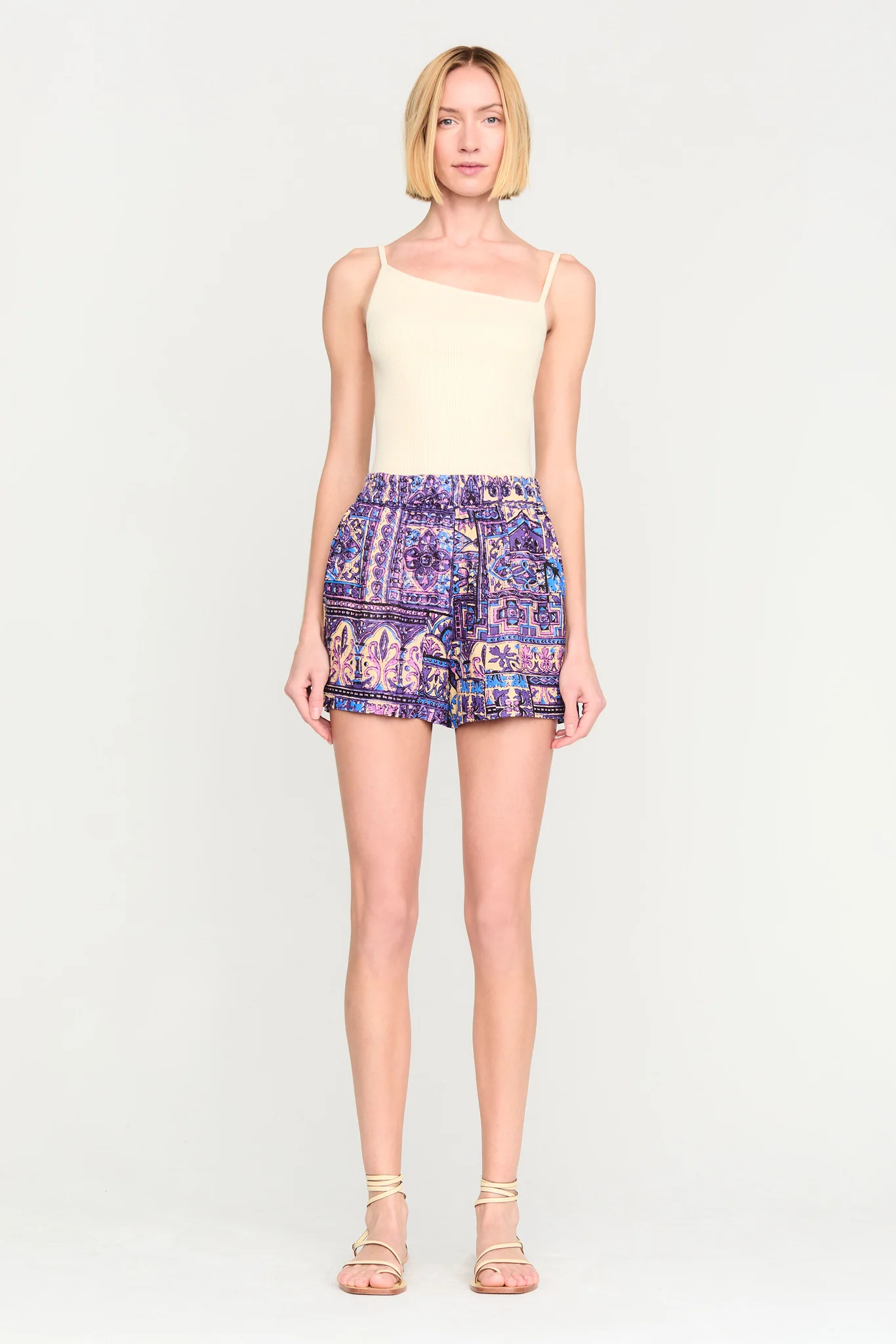 As comfortable as your favorite leisurewear but twice as chic, our 100% linen Monte short features a pull-on elastic waist. The relaxed fit style comes in two bold prints for spring and summer, including Violet Tile, an architecturally-inspired geometric in deep purple with pops of cobalt and pink. Pro tip: Style back to our asymmetrical Trini tank in classic black.