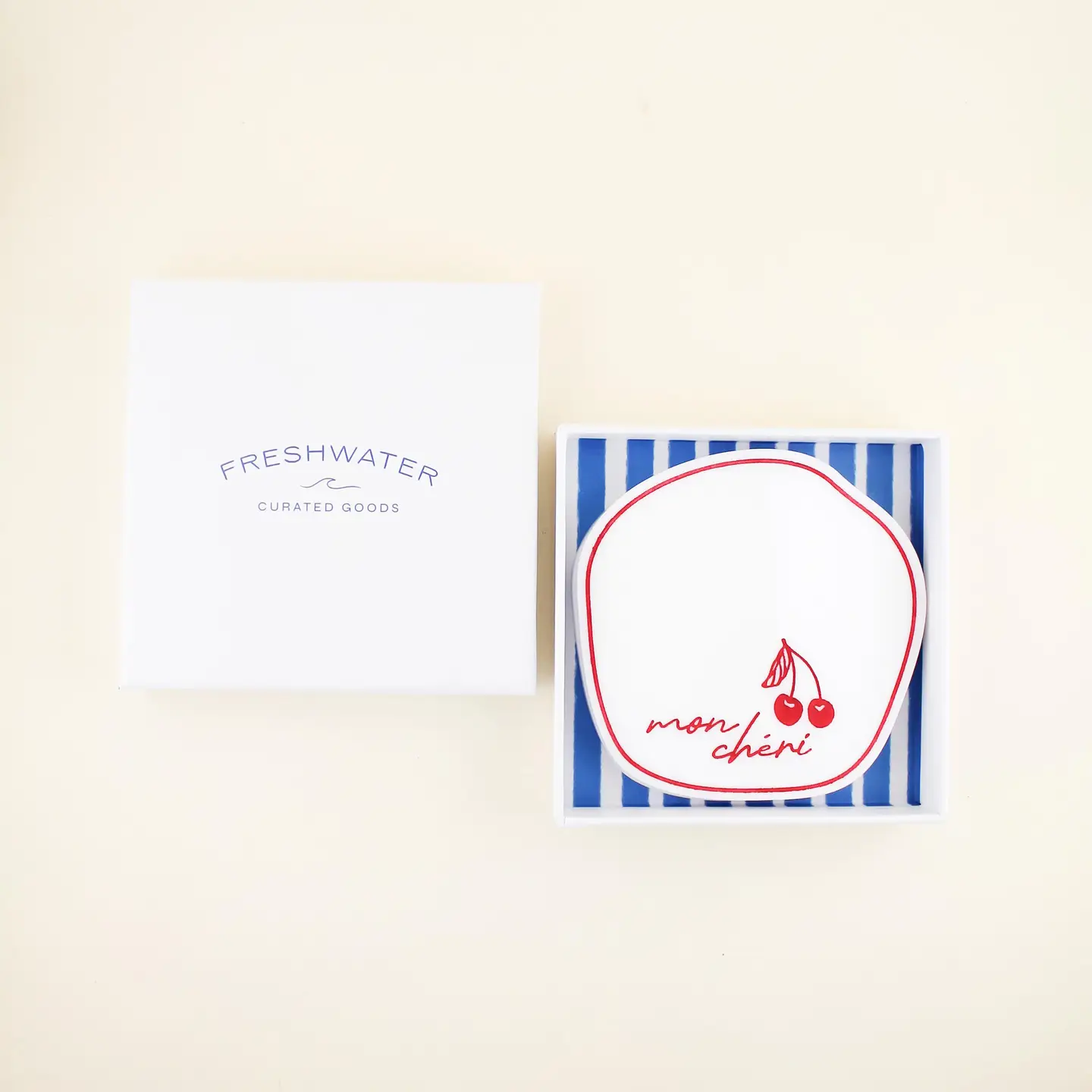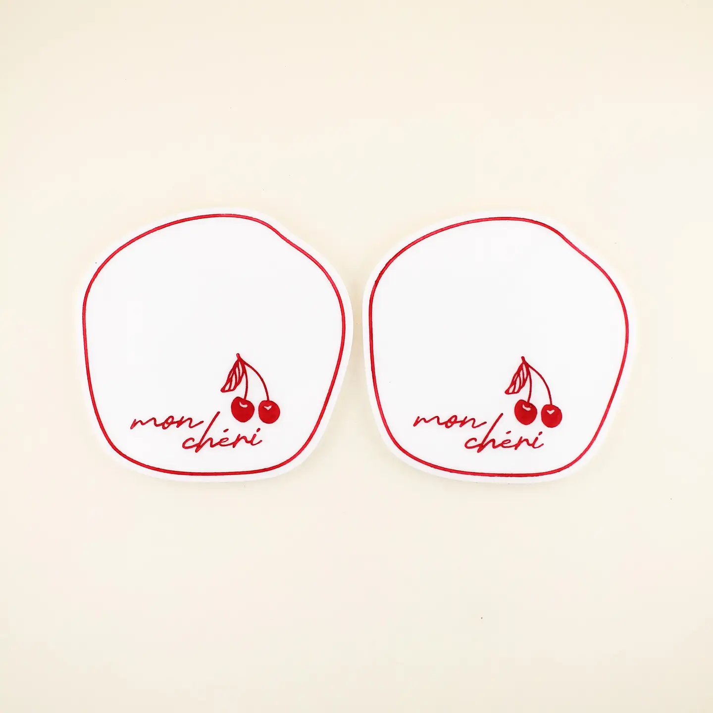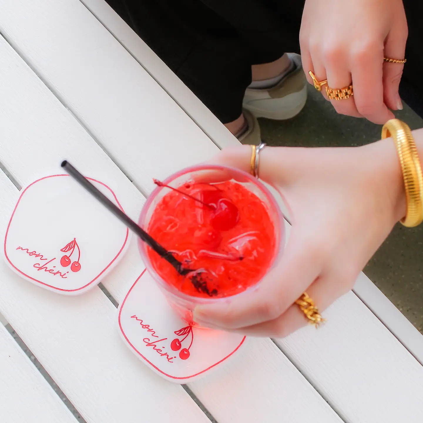 Our Mon Chéri Irregular Coaster Set is the perfect way to protect your furniture and also add the cutest little cherry detail to your decor. These handcrafted coasters are made of our high-quality acrylic and come in a set of two. DETAILS: - Coasters are sold as a set of 2 with gift box - Size: 4'' Diam x .25'' H - Made of premium acrylic with color-fill - Use a soft damp cloth to clean and keep inside - Handcrafted with love in Augusta, Georgia