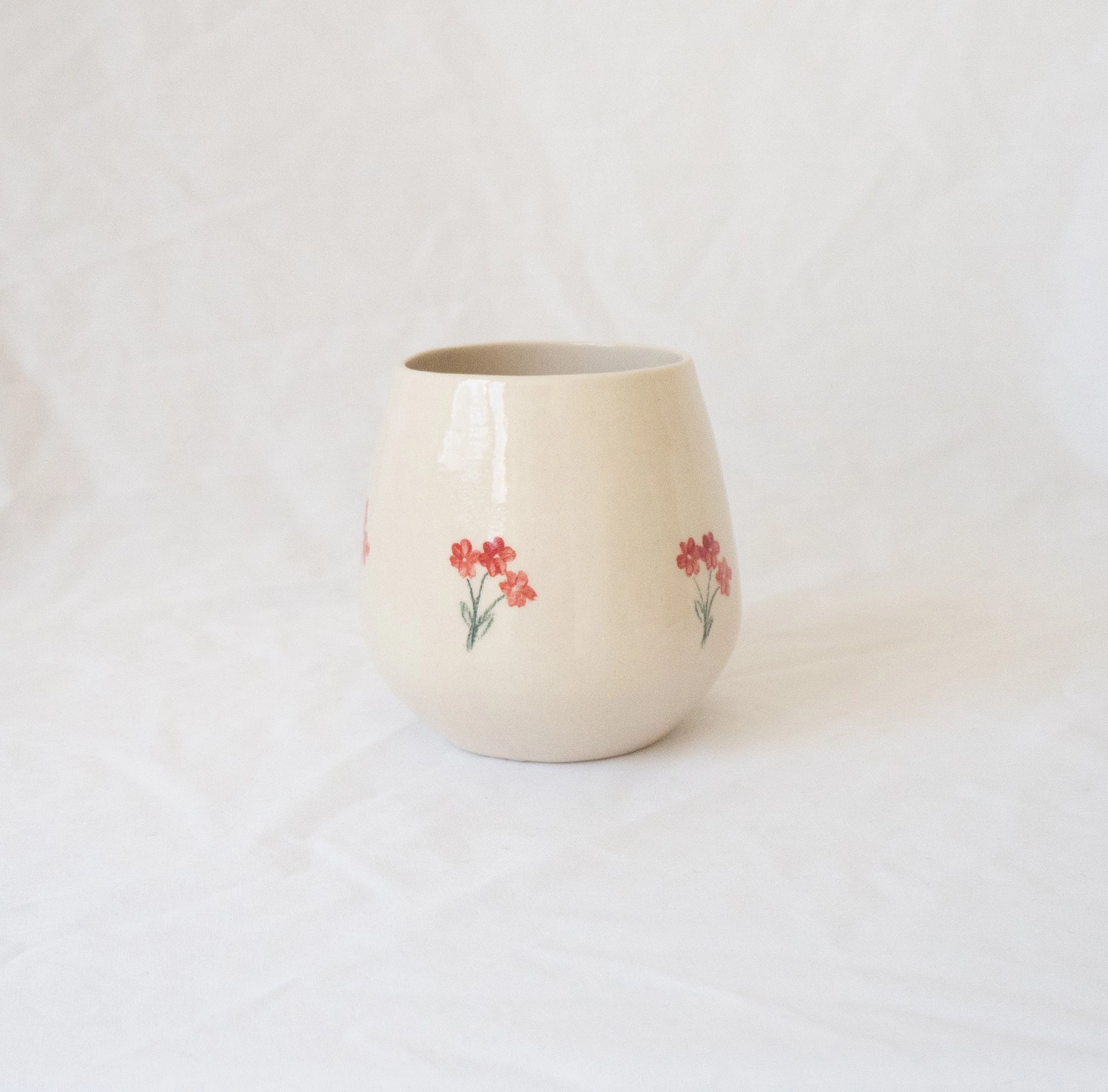 A handmade ceramic cup designed to emulate a stemless wine glass. Made with food safe ceramic materials and hand painted This softly rounded cup is the perfect vessel for coffee, tea, matcha lattes, and of course wine.