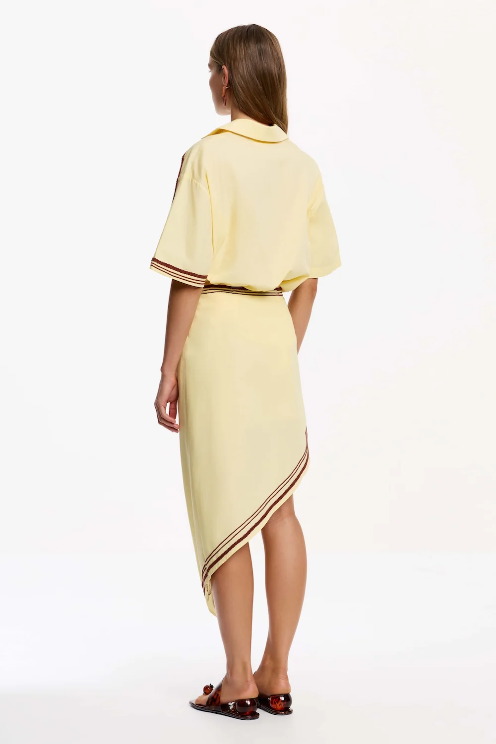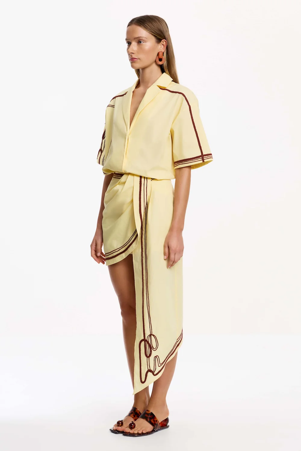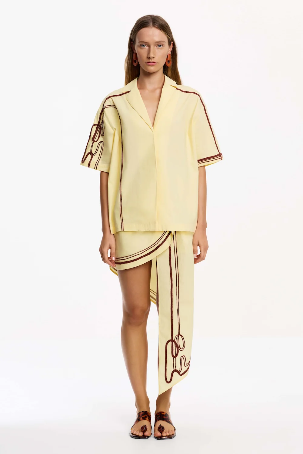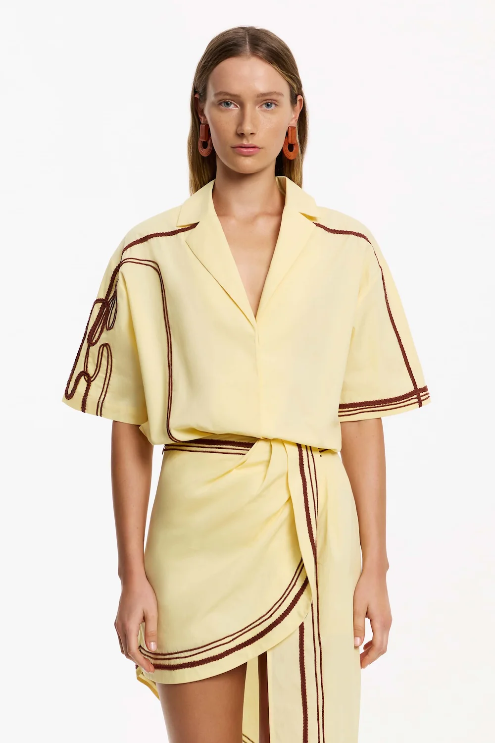 The Morrigan Shirt in Lemonade showcases modern refinement, balancing crisp lines with delicate detailing. This silhouette features signature embroidered accents and a concealed button placket for a clean finish. Defined side hem splits add a dose of movement, ideal for elevated everyday dressing, or pair with the matching skirt for a coordinated look.