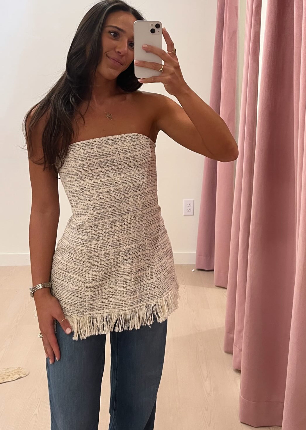 The Silvia Top is a strapless peplum style top with shaping at the hips and a fringe hem. The Silvia can be paired with the Grayson Pant for a matching set.