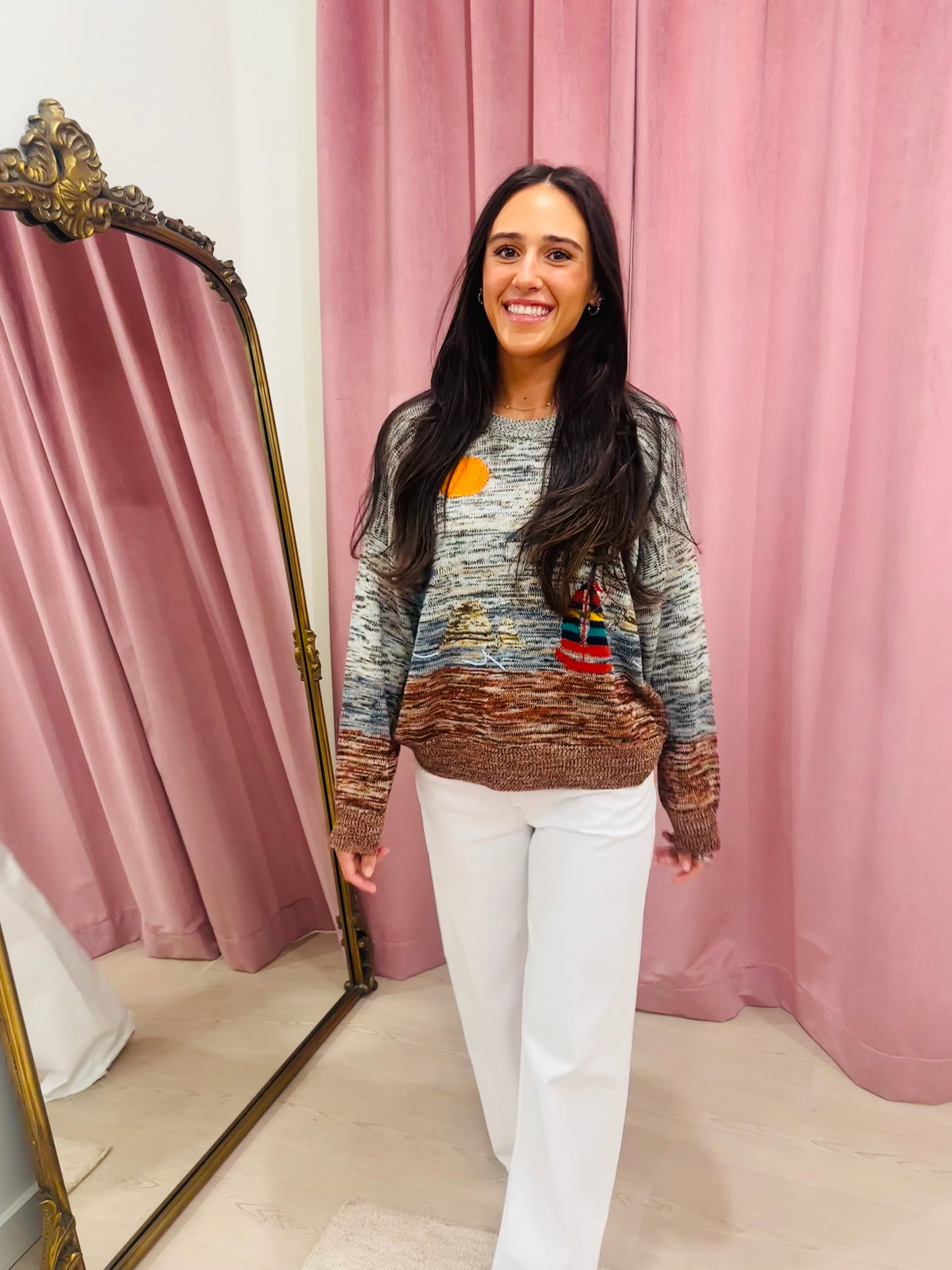 The Boating Pullover is inspired by a 1950s homemade children’s sweater — nostalgic, a little playful, and made to wear with abandon. This oversized crew features dropped shoulders, tapered sleeves, and an easy pullover fit that pairs effortlessly with flowy skirts or slouchy pants. Knit from a lightweight cotton blend yarn, it showcases a seascape landscape rendered in both intarsia and delicate embroidery — a nod to hand worked knits of the past, with charm stitched into every detail.