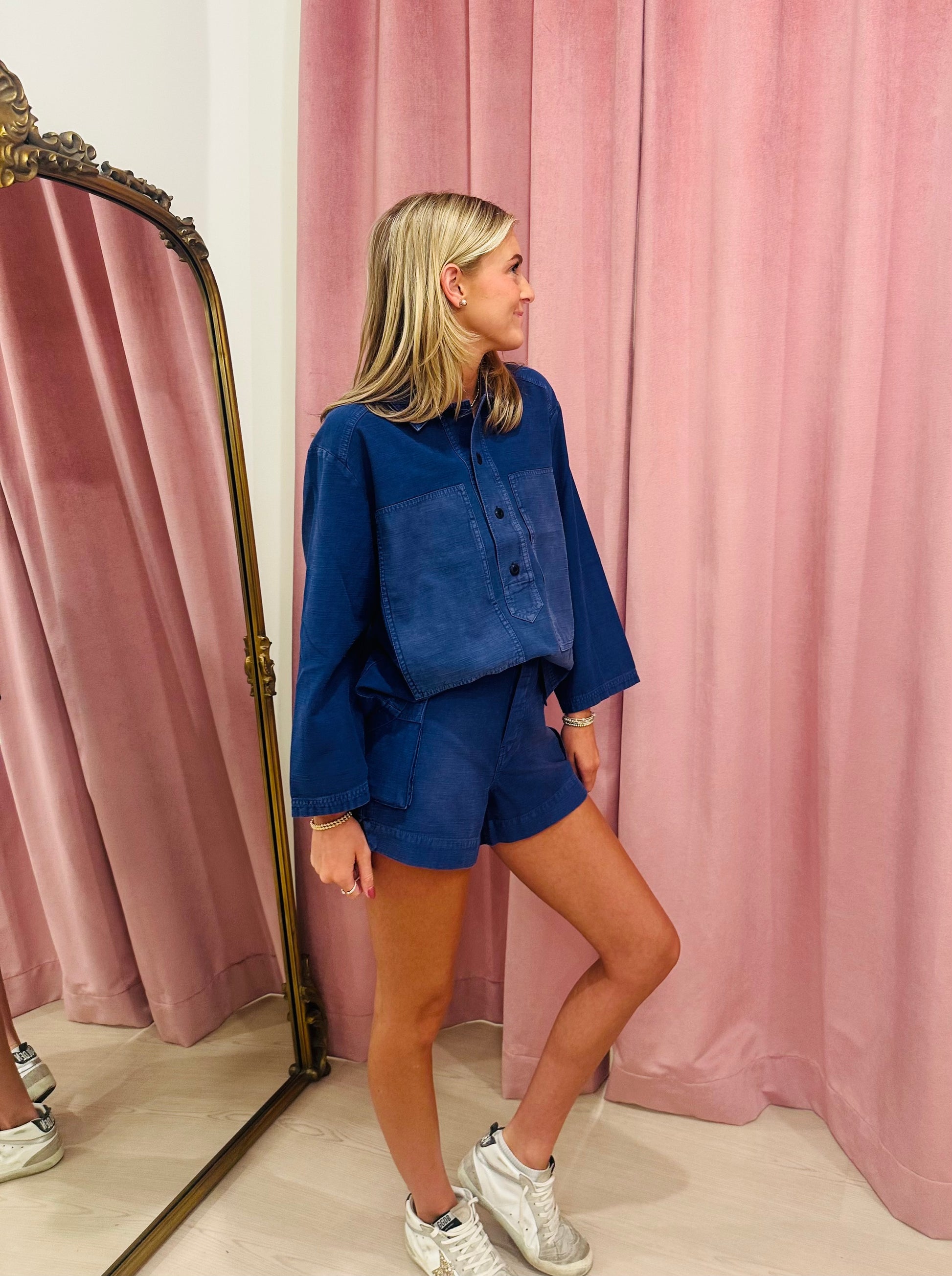 The Railway Shirt in Vintage Blue, is inspired by vintage workwear from the 1940s. Its relaxed, boxy fit and dropped shoulder offer a casual yet current shape. Featuring a shirt collar, oversized patch pockets, and corozo buttons, it's crafted from a military inspired cotton slub twill, it’s crafted with a sun faded wash for a vintage hand-feel we love.