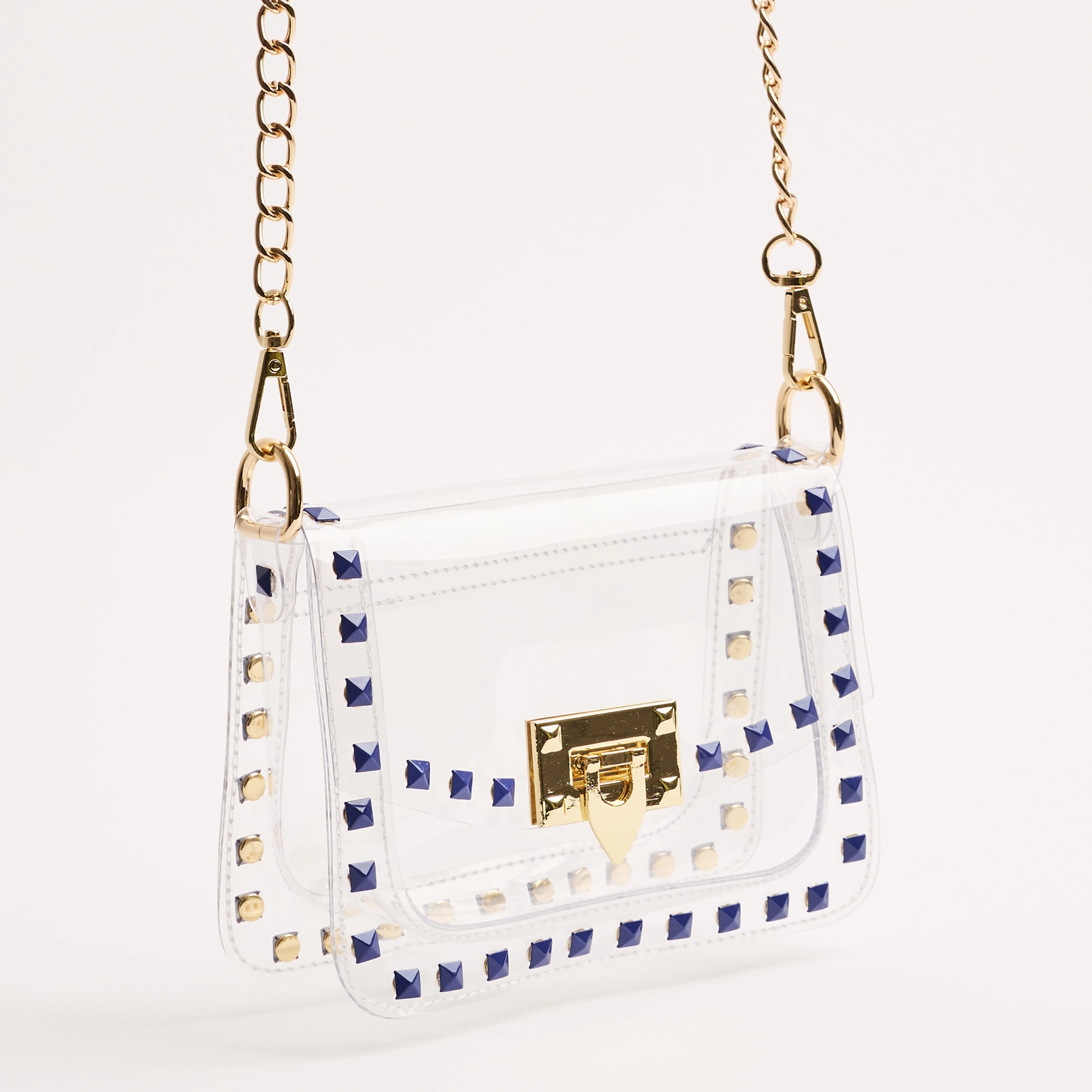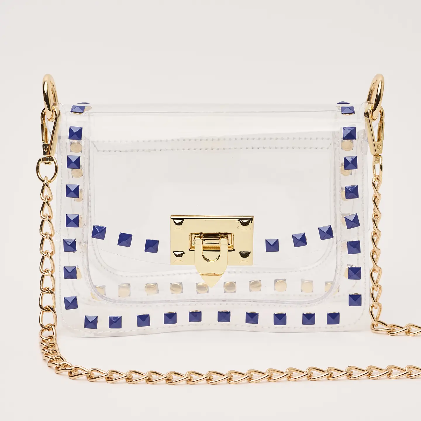 Score with the biggest winner in our clear handbag playbook - The Jackie! The Jackie changed the handbag game by proving clear handbags could be both functional and chic. This style includes royal blue square metal studs and a gold chain. The Jackie is NCAA and NFL-compliant and the ideal size to hold your wallet, phone, keys, lip gloss, and a few other small items. DETAILS: • W 8" x H 6" x D 3" • Durable PVC • Blue Square Stud Accent • Gold-Plated Hardware and Chain