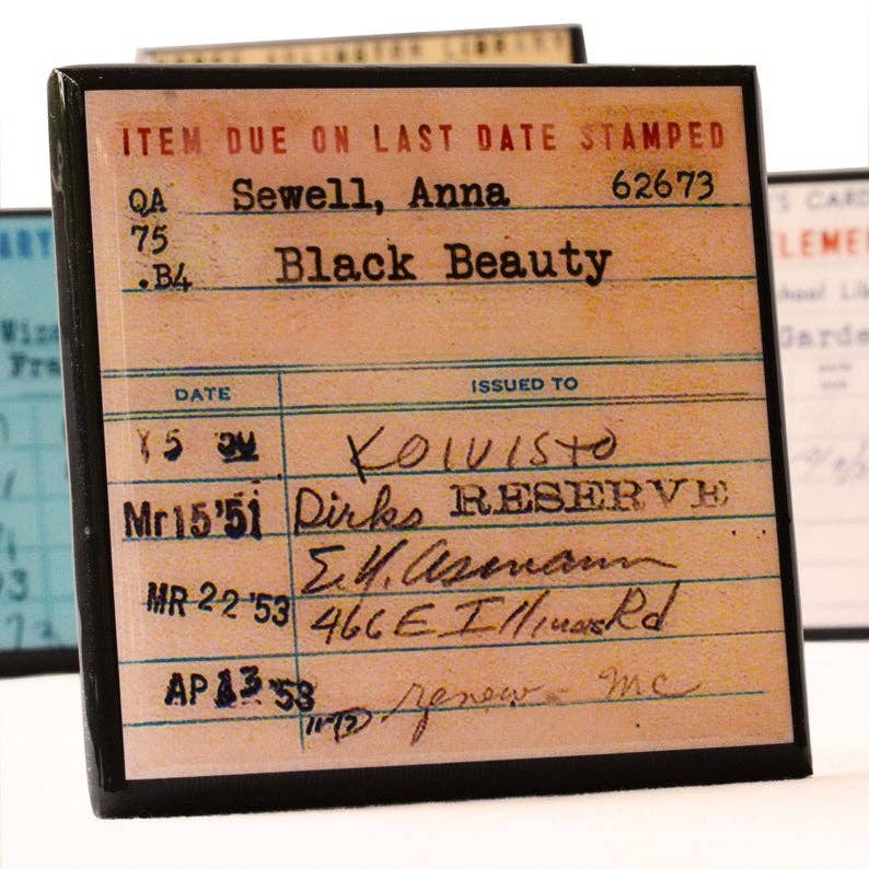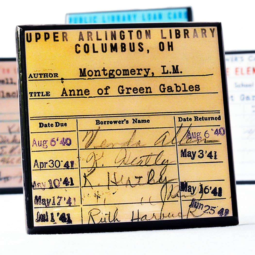 This library card coaster set is the perfect gift for the librarian, book club hostess, or general book lover in your life! Based on vintage due-date cards, these colorful wood coasters are sure to charm and evoke memories. They feature classic children's books: Black Beauty, Anne of Green Gables, The Wizard of Oz and the Secret Garden. Let them curl up with a good book and have the perfect place to rest their cup of hot chocolate Each coaster set comes in a decorative wrapper - perfect for that easy, affordable ready-to-go gift! With an MDF base and a cork back every coaster is sealed with a water proof, heat resistant resin (similar to that used to coat restaurant bars or tables) that provides a glossy finish and guarantees a long life.