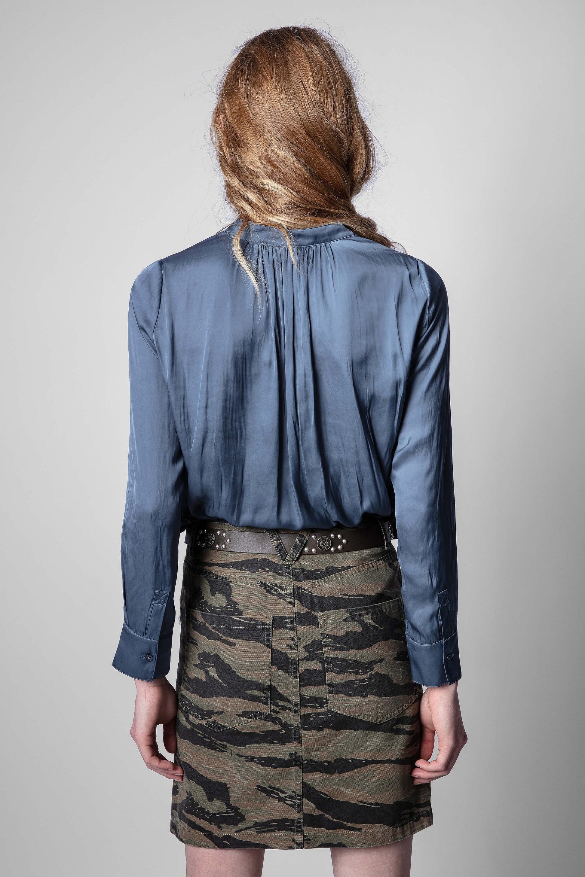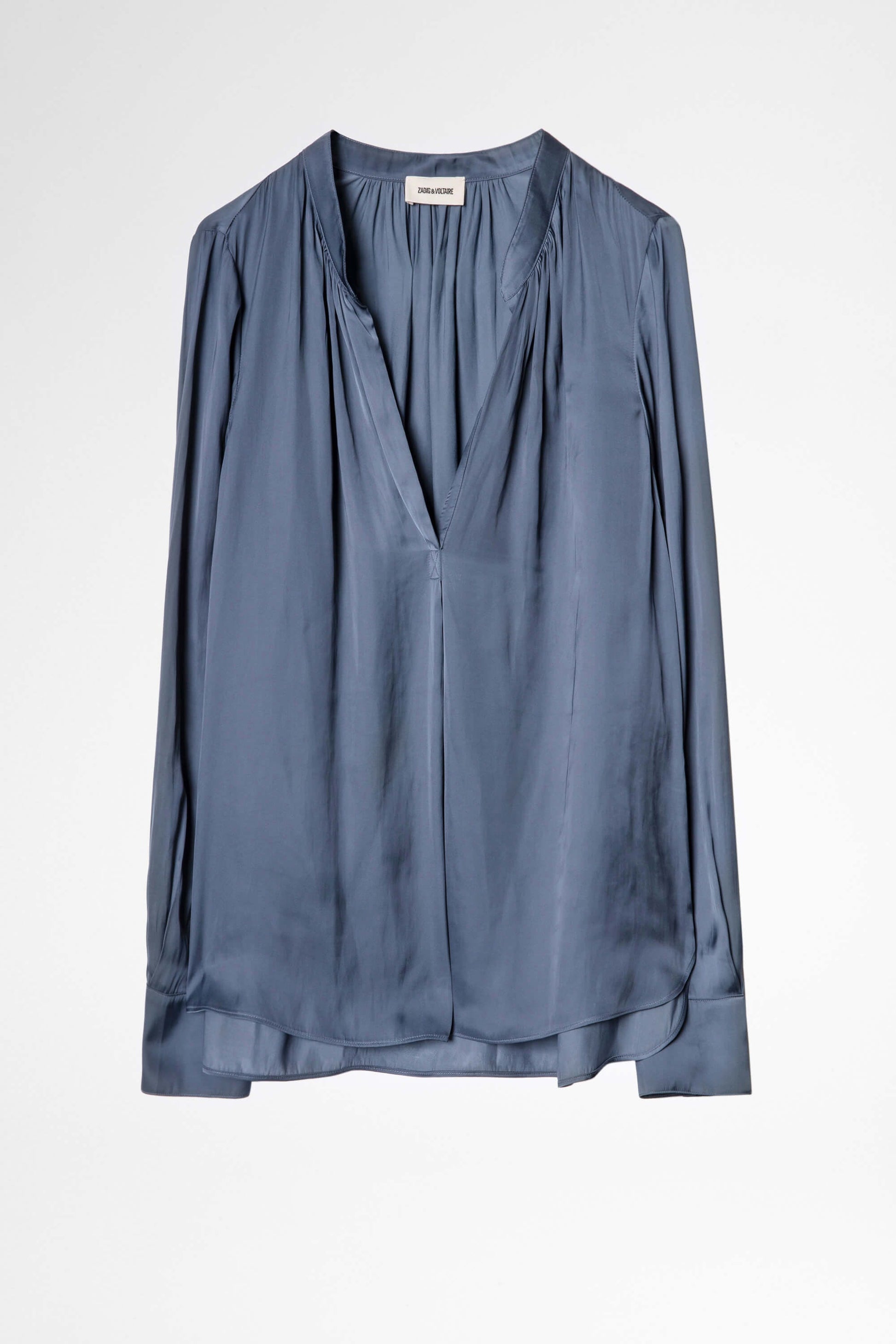 With a delicate satin finish, this blue open-collar tunic with long sleeves can be worn casually with jeans or rock-style with leather trousers.