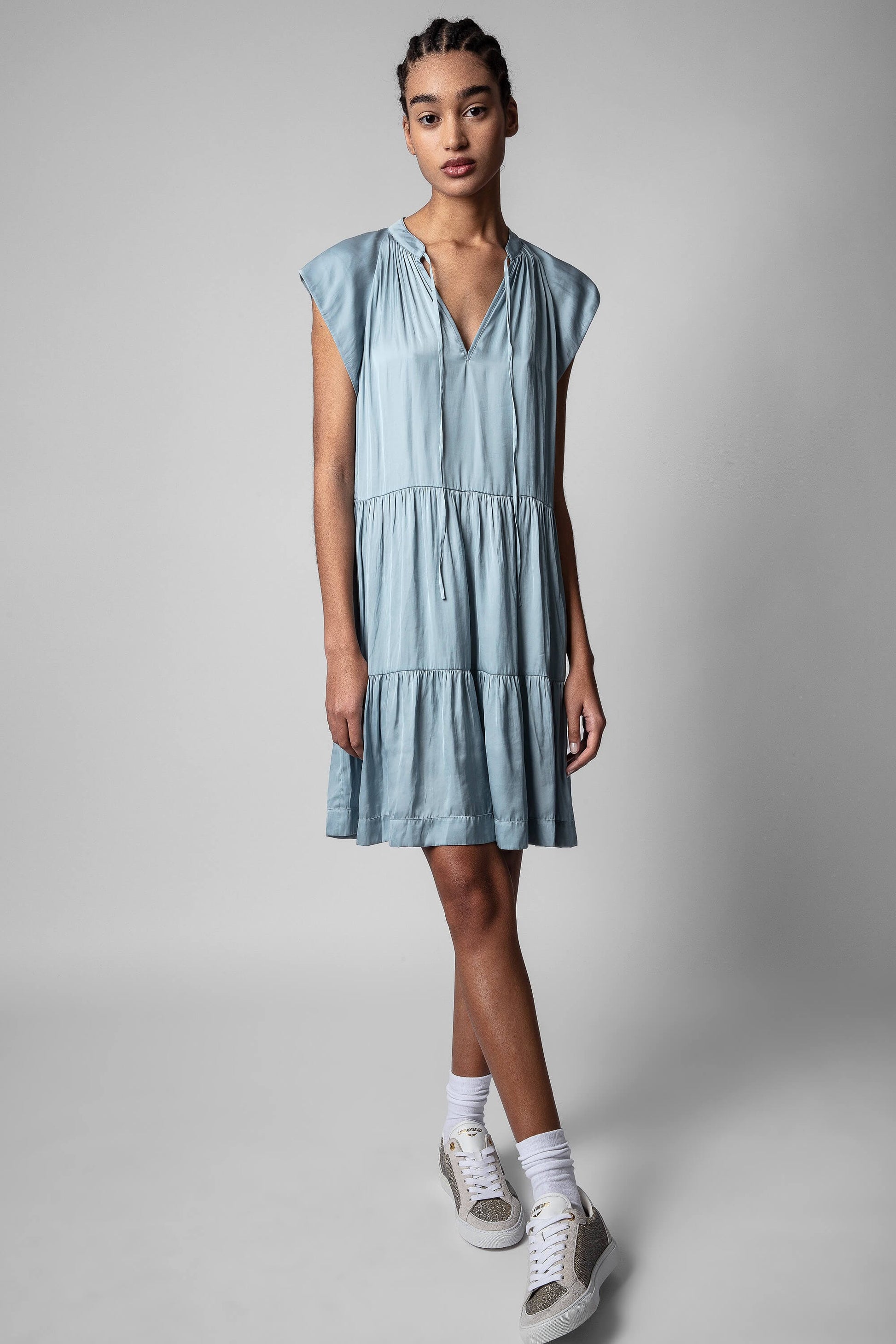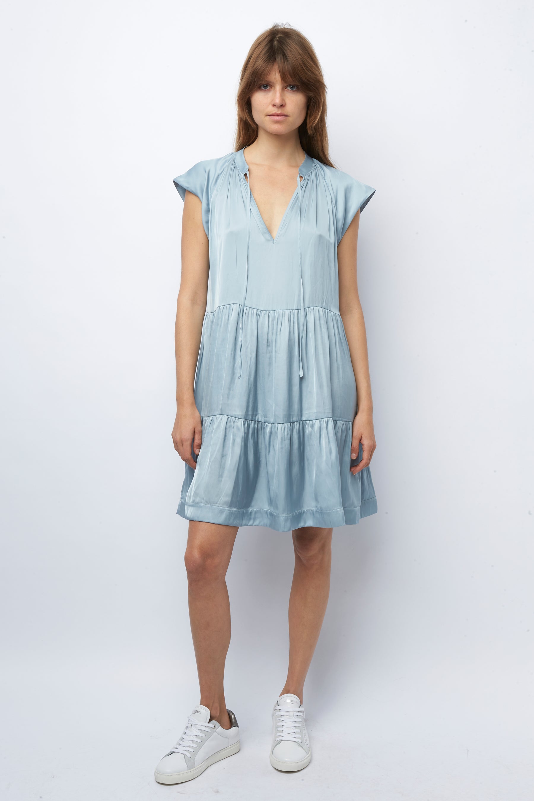 Lightweight and ultra-feminine, this ruffled satin dress has a tied neckline and short sleeves.