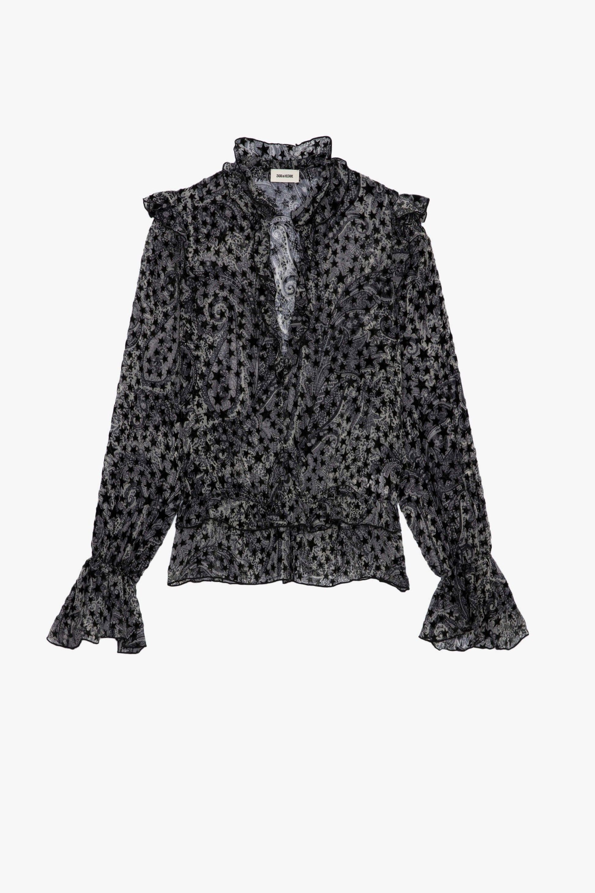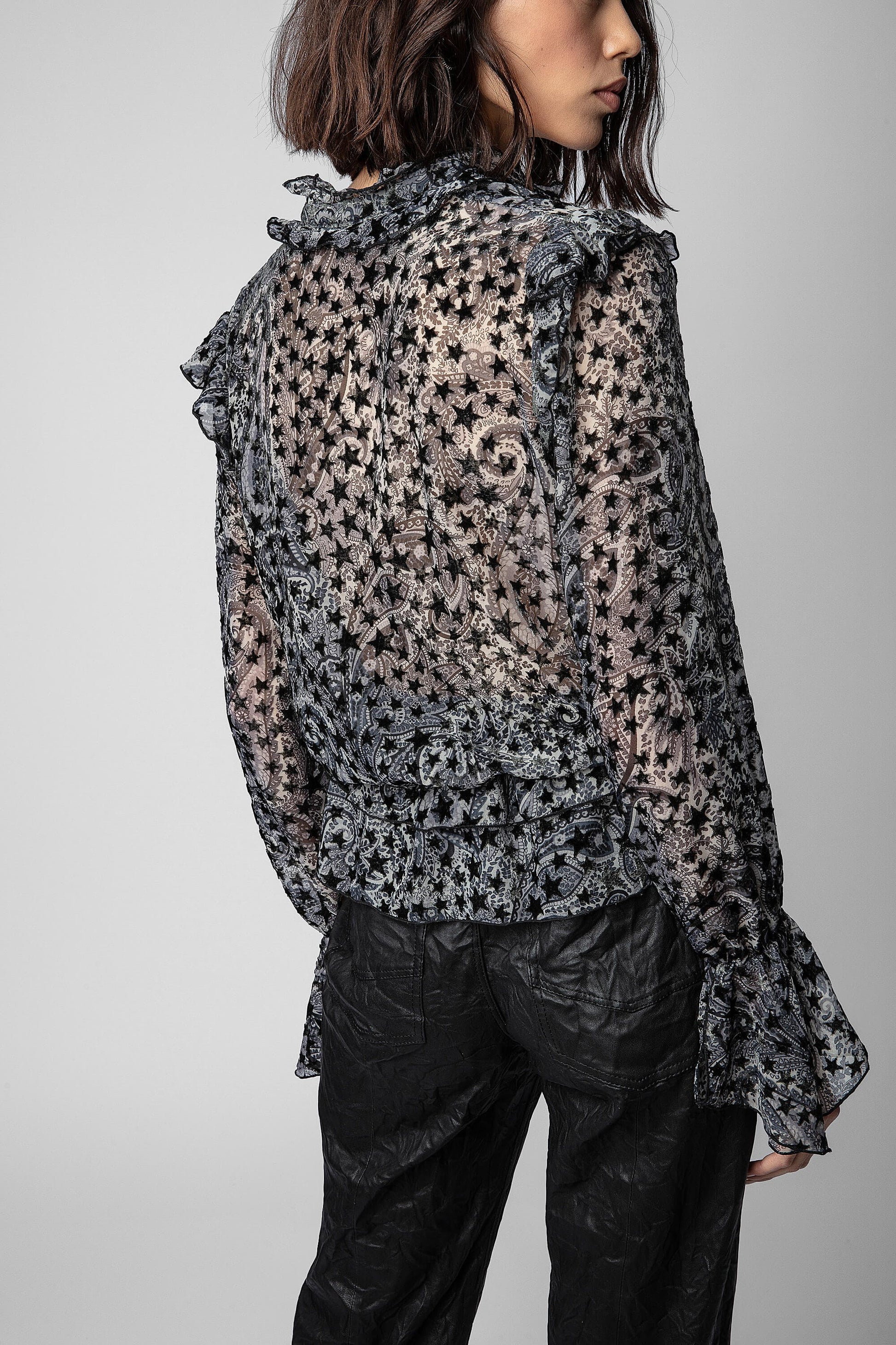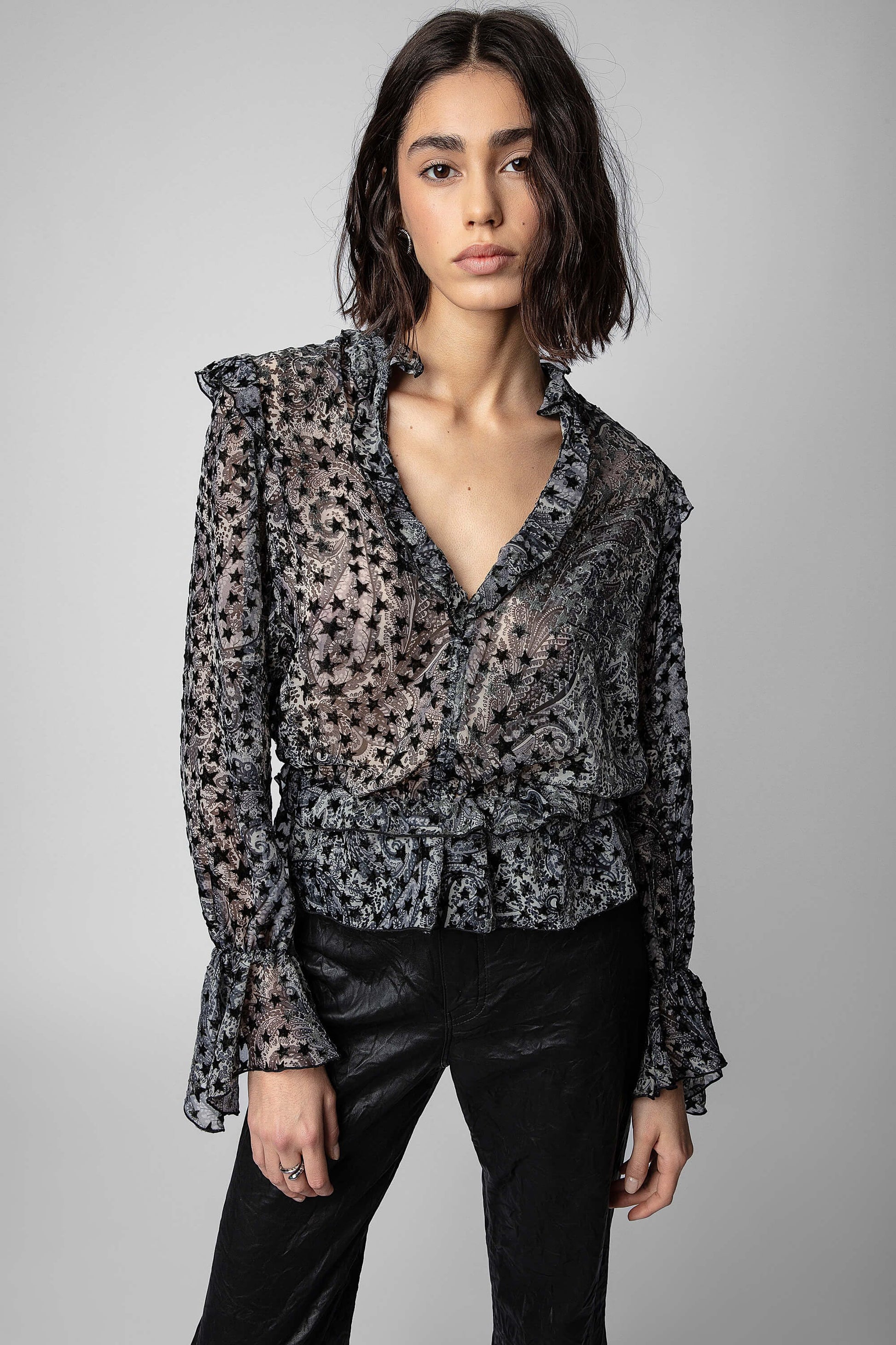 Transparency effects for this floaty blouse adorned with a paisley print and velvet stars. Ruffled details on the sleeves and collar provide a light, airy look.